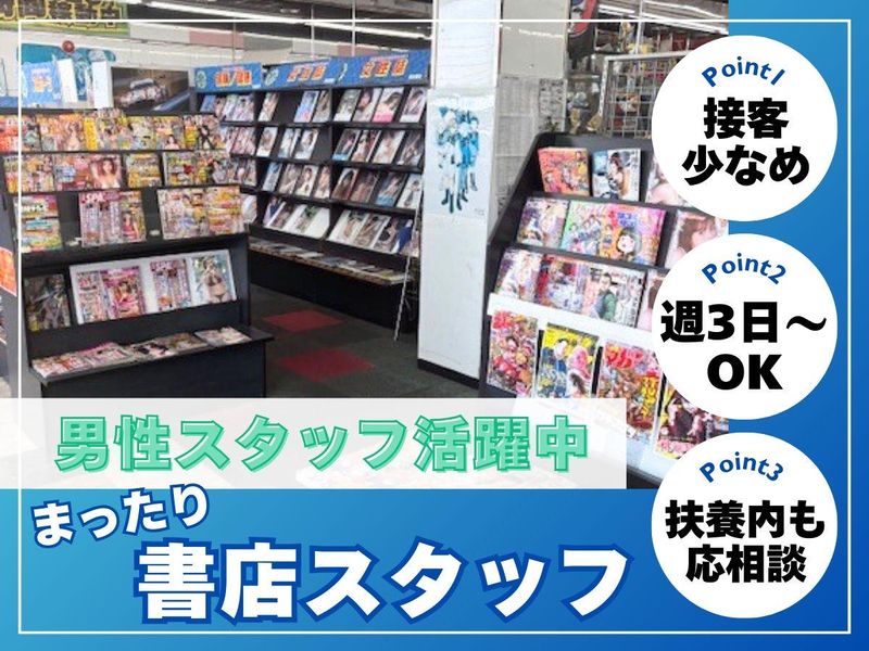 仕事内容 未経験歓迎✨週3日~OK✨勤務時間相談OK 扶養内勤務応相談✨接客少なめ✨ ┎┈┈┈┈┈┈┈┈┈┈┈┈┈┈┈┈┒ 書店スタッフ募集! 品出しメインでモクモク作業多め 男性スタッフ多数活躍中! ┖┈┈┈┈┈┈┈┈┈┈┈┈┈┈┈┈┚ ◣ 仕事内容 ◥  ̄ ̄ ̄ ̄ ̄ ̄ ̄ お任せするのは、書店での販売・陳列を 中心としたシンプルなお仕事です。 来店数は少なめなので接客は最小限、 レジ対応や商品の品出し作業がメイン。 未経験の方でも安心してスタートできます。 ◣ 業務詳細 ◥  ̄ ̄ ̄ ̄ ̄ ̄ ̄ ❐ 書籍・雑誌・DVD・雑貨の 販売や買取などのレジ対応 ❐ 新商品の陳列や売り場づくり ❐ 納品対応・在庫管理 入社後は丁寧な研修があり、先輩スタッフが 隣でサポートしてくれるので安心! 力仕事はほとんどなく、 落ち着いた環境でコツコツ取り組めます。 ※一部アダルト商品の取り扱いがあります。 ┈┈┈┈┈┈┈┈┈┈┈┈┈┈┈┈┈┈┈ \男性スタッフ多数活躍中/ 現在、20代を中心に男性スタッフが 活躍しています。 「接客に追われない職場で働きたい」 「落ち着いた環境でマイペースに働きたい」 という方にぴったり。 シフトは柔軟に調整できるので、 自分に合った勤務が可能です。 ┈┈┈┈┈┈┈┈┈┈┈┈┈┈┈┈┈┈┈ \のびのび働ける落ち着いた環境/ 平日の来店数は1時間に5人程度。 夜勤はさらに少なめで、ゆったり 勤務できます。 週末でも来客は10~20名程度なので、 接客に追われることはありません。 一人ひとりが自分のペースで業務を 進められる環境です。 ┈┈┈┈┈┈┈┈┈┈┈┈┈┈┈┈┈┈┈