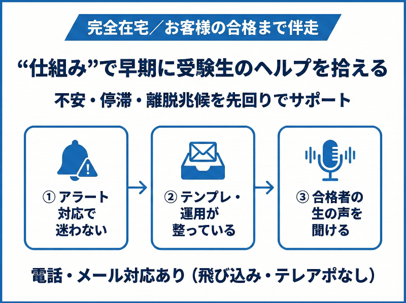 仕事内容: \教育×テクノロジーで、受験生の未来を一緒にサポート/ 令和の新しい大学入試(総合型選抜・推薦入試)に挑む受験生とそのご家庭を、フルリモートでサポートするお仕事です。 「フルリモートで働きたい」「成長しながらしっかり稼ぎたい」そんな20〜30代の仲間が活躍中!業務はマニュアル化が進んでいるので、未経験でも安心してスタートできます。 【✅️POINT】 ・全国どこでもOK!フルリモート/服装自由/髪型自由 ・充実研修・OJTでゼロから学べる ・勉強を教えるわけではないので、受験の専門知識は必要なし ・受験生の合格に向けて伴走する、やりがいのある仕事 ・20~30代の社員が9割です! 【✅️活躍している転職者のイメージ】 ◎Aさん(26歳・元コールセンタースタッフ)/年収360万円 不安が強くなっている保護者・生徒の相談を受け、状況を丁寧に整理して“次にやること”を一緒に設計。 受講への迷いがあった家庭が前向きになり、学習のリズムを取り戻して継続につながった。 「私の関わり方で、明確に生徒さんの表情が変わる瞬間があるんです。最後に『安心しました、続けます』って言ってもらえたときは、本当に嬉しかったです。」 ◎Kさん(35歳・元学習塾の事務)/年収320万円 やる気が落ちた生徒の状況を、学習記録・面談メモ・家庭状況から整理して“原因を見える化”。 教師との連携で、本人が納得できる目標に立て直し、学習の再スタートにつなげた。 「ただ励ますんじゃなくて、“やる気が落ちる理由”を一緒にほどいていく感じ。『もう一回やってみる』って言ってくれた瞬間、これがCSの仕事だなって思いました。」 ◎Nさん(36歳・元学習塾の校舎長)/年収340万円 校舎運営で培った“抜け漏れを潰す力”を、オンラインのCS業務に最適化して活躍。 システムが出す各種アラートを毎日チェックし、優先順位をつけて着実に対応。 「感覚頼りじゃなくて、仕組みが“危険信号”を教えてくれるのがありがたいです。私の仕事は、それを見逃さずに一個ずつ潰していくこと。対応が早いほど、生徒さんの合格につながることを実感してます。」 【✅️仕事内容】 教育×テクノロジーで急成長中の大学受験向けオンライン個別指導サービスにて、受講中のご家庭(保護者様・お子様)のカスタマーサクセスを担当。 学習状況やコミュニケーションの変化をもとに、不安・停滞・離脱兆候を先回りで察知し、合格までの伴走を行います。 自動化が進んでいるので、システムが出すアラートに着実に対応していくことで、ヘルプを早期に拾えるのが特徴です。 【⏰️お仕事の流れ】 1. お客様からのお問い合わせ対応 ・お客様からお問い合わせがあった際に、電話やメールを用いて対応します。 ・安心して受講を継続してもらえるよう、サポートする業務です。 2. 受講管理 ・システムを使って、振替や受講ペースの管理を行います。 ・契約更新月には、次月以降の請求についての確認を行います。 3. アンケート対応、定期ヒアリング ・毎回の指導で生徒さん、保護者さんから提出されるアンケートを確認し、必要に応じて対応します。 ・時々こちらからお電話をし、順調に学習へと取り組めているかを確認します。 4. 合格管理、退会対応 ・受講終了に合わせて、合否の確認を行ったり、退会手続きを行ったりします。 ・合格した生徒には、合格者インタビューを行います。インタビューは、特に喜びを感じられる仕事です。