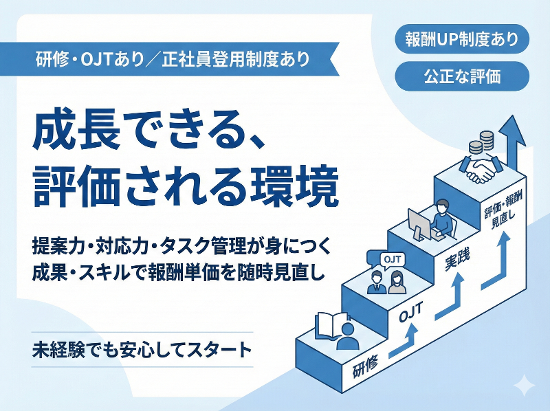 時給1,300円以上 給与: ◆報酬体系 * 稼働1時間あたり 1,300円〜(実績に応じて変動) * 成果・スキルに応じて報酬単価を随時見直し⭕ ◆研修について 研修期間中は、稼働1時間あたり 1,200円の報酬となります。 一通りの業務を覚えたら、研修期間は終了です。 ※早い方であれば1ヶ月ほどで研修期間を終えることができます。