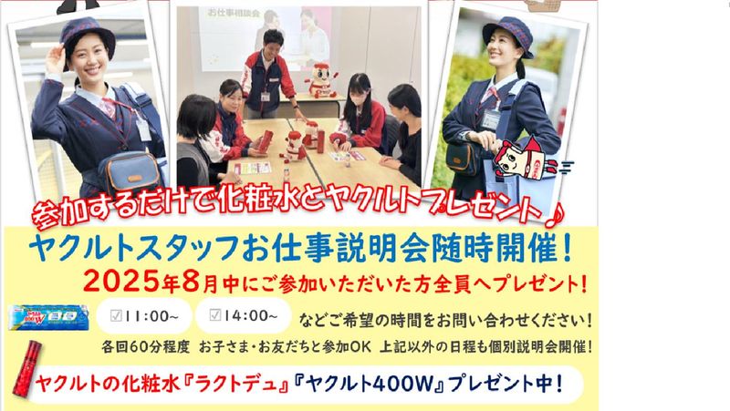 仕事内容 子どもに“おかえり”が言える仕事、始めませんか?」 「あなたの笑顔が、地域の健康を支えます」 \✨ママさん活躍中✨/ 子育てと両立できるヒミツは… ⏩point1:手厚い子育てサポート 保育料の助成制度をご用意! お子さまを預けて安心して働けます◎ ⏩point2:平日のみ&短時間勤務 夕方までにはお仕事が終わるので お子さまの「おかえり」が言えますよ♪ ⏩point3:未経験でも安心 ノルマなし&3ヶ月の収入保証あり! 自分のペースで始められます✨ ┏━━━━━━━━┓ ◆ お仕事内容 ◆ ┗━━━━━━━━┛ お客さまに笑顔と健康をお届けする ヤクルト商品の配達スタッフです♪ 地域の皆さまとふれあえるお仕事✨ 担当エリアの個人宅やオフィスへ ヤクルト商品をお届けします。 いつもお会いするお客さまばかりなので おしゃべりも楽しみの一つになりますよ⭐ ✅配達エリアは宮崎県内です! ご希望の勤務センターをご相談ください♪ ✅土・日・祝日、盆・年末年始が お休みなので、家庭や自分の時間も 取りやすいお仕事です♪ ✅「完全歩合制」のため、 頑張りがしっかり給料に反映します! 入社から3か月間は収入保証があるので 未経験でも安心です ☆自分に出来るか不安な方へ、 一日体験やお仕事説明会も実施中! まずはご応募お待ちしております♪ 【働くママさん・子育て世代を応援!】 ・-・-・-・-・-・-・-・-・-・-・-・-・-・-・-・-・-・-・ ⭐保育料助成制度あり⭐  ̄ ̄ ̄ ̄ ̄ ̄ ̄ ̄ ̄ ̄ ̄ ̄ 保育園や幼稚園にお子さまを預けている方へ 保育料の助成制度があります! (お子さま1人あたり月5,000円支給) 子育て中の出費もサポートします! ⭐車・バイク通勤OK⭐  ̄ ̄ ̄ ̄ ̄ ̄ ̄ ̄ ̄ ̄ ̄ ̄ 無料駐車場を完備しています! 毎日の通勤もラクラクです♪ ヤクルトセンターで商品の準備をして、 自分のペースで配達に出発! お客さまとのおしゃべりも楽しみの1つです♪ ⏰とある1日のスケジュール例⏰ 08:30 出勤!お届け準備をします✨ 09:00 お客さまの元へ出発! 「こんにちは!」と笑顔でお届け♪ 12:00 センターに戻ってランチタイム! ママさん仲間とおしゃべりも楽しい⭐ 13:00 売上の確認と明日の準備 14:00 お仕事終了!お疲れ様でした! お子さまのお迎えにも間に合います◎"
