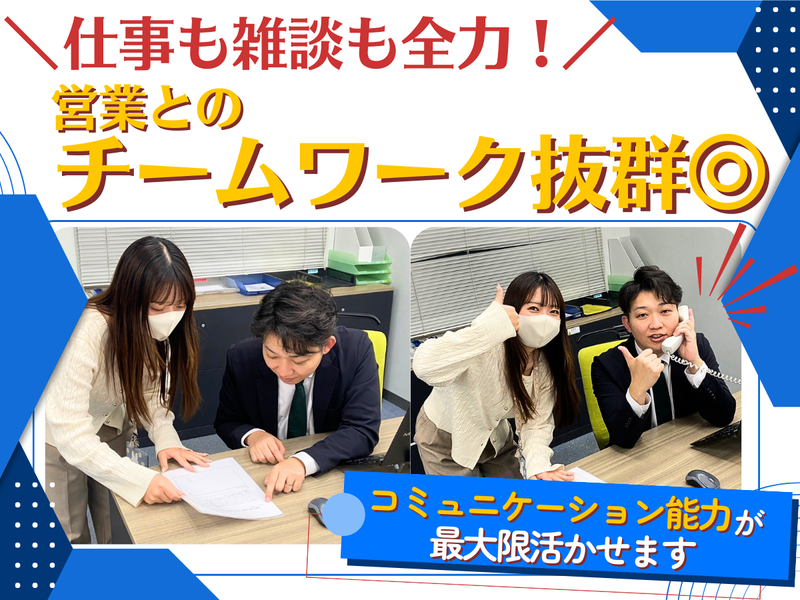 仕事内容 ╭────────────・⭐・・─╮ 世界No.1の採用プラットフォーム ”Indeed”を扱う広告代理店勤務! ╰─・・⭐・────────────╯ お客様企業の採用成功を実現するために、 営業担当のパートナーとして課題解決を サポートするお仕事です! ――――――――――――――――――― ⛵具体的には… ✅掲載までの顧客フォロー ┗求人原稿の内容確認・修正対応 ┗申込書・見積書など必要書類の準備 ※お客様との連絡はメール・電話がメイン! ※外勤はなく、オフィス内での対応です ※原稿内容について「○○さんいる?」と 直接ご連絡をいただくこともあります! ✅求人原稿の作成・修正 ┗作成専門グループもありますが、 自分で対応した方が早い場合は、 そのまま自分で進めることもあります。 ✅営業サポート ┗「お客様にこれ伝えてますか?」 「この発注どうなってますか?」など 営業担当と連携しながら、 案件の進行をサポート… いや、お尻たたきをします!笑 ※営業ノルマなどはありません! ――――――――――――――――――― ⛲この仕事の面白みは?⛲  ̄ ̄ ̄V ̄ ̄ ̄ ̄ ̄ ̄ ̄ ̄ ̄ ╒━━━━━━━━━━━━━━━━━━╗ ⏩コミュニケーション力が磨かれる! ╘━━━━━━━━━━━━━━━━━━╝ お客様はもちろん、社内の他部署など 多くの方と関わるポジション。 言葉選びやレスポンスの質で 信頼関係を築く力が身につきます。 社内外をつなぐ“橋渡し役”として 活躍できるやりがいのあるお仕事です。 ╒━━━━━━━━━━━━━━━━━━╗ ⏩様々な業界の発見がある! ╘━━━━━━━━━━━━━━━━━━╝ お客様は飲食、販売、福祉、運送、 建設など多岐にわたります。 お客様とのやり取りの中で、 業界のことを教えていただく機会も多く、 「こんな仕事があるんだ!」と 新しい発見に出会えることが魅力です。 あなたのこれまでの経験や視点を活かして 求人原稿を作ることができることも この仕事の面白さです⭐ ╒━━━━━━━━━━━━━━━━━━╗ ⏩頑張りはしっかり評価します! ╘━━━━━━━━━━━━━━━━━━╝ 週1回の社内新聞や、営業所のメンバー内で 毎月感謝を伝えるMVP制度を実施しています。 日々の頑張りをきちんと見てもらえる 風通しの良い職場です◎ ――――――――――――――――――― ⛲未経験でも安心の研修ステップ⛲  ̄ ̄ ̄V ̄ ̄ ̄ ̄ ̄ ̄ ̄ ̄ ̄ ̄ ̄ ̄ ̄ step①:求人原稿の作成(入社後1ヶ月間) 動画で作成の流れを学び、 原稿の表現ルールやシステムの使い方を習得。 step②:顧客対応(入社後2ヶ月目~) indeedなどの商品知識を身につけながら、 電話・メールでのお客様対応にも挑戦。 最初はうまく話せなくても大丈夫! お客様の話を聞くことから始めましょう! step③:営業とタッグを組んで案件対応 (入社後3.4か月目~) 営業担当と連携しながら、 企業の採用成功をサポートしていきます。 隣には気さくなベテランの先輩がいるので、 困った時はすぐにフォローします✨ ※経験者は研修を短縮する場合があります コンスタントにチームリーダーとの 振り返りも行いますので、仕事の悩みや 働き方の相談も話せる環境があります!
