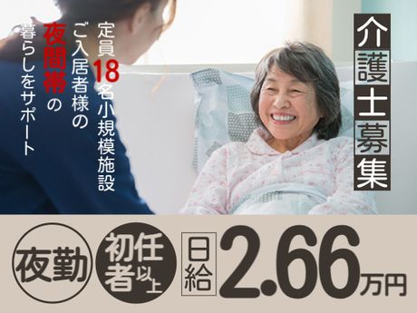 \初任者研修以上!日給2万6600円/小規模施設の夜勤♪1ユニット1名体制|週2回~|交通費全額支給
