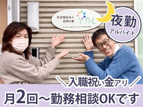 <社会福祉法人訪問の家> 社会福祉法人訪問の家は、「一人一人を大事にし、障害のある人も高齢者も、誰もが健康で平和に暮らせる、真の豊かさをもつ社会づくりを目指す」を理念とし、1986年に開設いたしました。 神奈川県横浜市栄区・磯子区・旭区などで障害者や高齢者の支援事業を展開し、誰もが住み慣れた地域で暮らせる社会を目指して、地域生活の支援を行っています。 外部からの見学や実習の受け入れも多く、内にも外にも開かれた法人です。 <障害者分野> ○障害者通所施設 ・生活介護事業所 朋 ・生活介護事業所 朋第2 ・生活介護事業所 集 ○横浜市法人型地域活動ホーム ・地域活動ホーム 径 ・径・さかえ次世代交流ステーション ・地域活動ホーム 連 ・連 相談支援室 ・旭区障害者後見的支援室 絆 ○横浜市多機能型拠点 ・郷 ○障害者グループホーム ・栄区 8か所 ・磯子区 3か所 ・旭区 2か所 <高齢者分野> ・横浜市根岸地域ケアプラザ ・横浜市桂台地域ケアプラザ <居宅介護支援事業> ・ヘルパーステーションさくら草 <公益事業> ・朋診療所 ・郷診療所 ・横浜市介護予防・生活支援サービス補助事業(サービスB)花かご <社会福祉法人訪問の家の運営するグループホームについて> 一般住宅の規模(定員4名~6名)のグループホームを、横浜市磯子区、旭区、栄区に合計13か所運営しています。 30代から60代までの、知的障害・身体障害・精神障害がある方などが暮らしています。 4名の入居者に対し、数名の世話人や看護師・ヘルパーが支援に携わっています。 身の回りの支援を多く必要とする方も、グループホームで当たり前に暮らし、地域の方々との交流が出来るよう、繋がりを大切に考えているグループホームです。 様々な経験を持つスタッフが集まり、連携・協力を取ることで、入居者様のサポートを行っています。 <入職祝い金の支給あり!> このページから直接応募された方には、入職祝い金をプレゼントします!(規定あり)