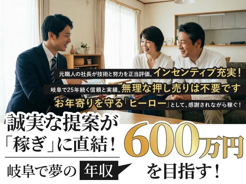 仕事内容 ✨年収600万円以上を 本気で狙える環境です ✨転勤なし!地元岐阜で 腰を据えて働けます ✨未経験でも安心! 魔法のマニュアルあり \稼ぎたい欲求を、 実績No.1の武器で叶える/ 岐阜県で売上No.1! 圧倒的な知名度があるから 未経験でも初月から 成果が出せる環境です。 【✨10秒でわかる魅力】 ✅テレアポ・押し売りなし ✅岐阜県1位の圧倒的知名度 ✅スピード昇進・昇給が可能 ✅20代〜40代が幅広く活躍 ✅魔法のトークマニュアル完備 【✨具体的な業務内容】 ✅屋根や外壁の劣化チェック ✅お困りごとのヒアリング ✅点検日のアポイント取得 ※難しい商談や契約は 専門スタッフが担当します。 あなたは「きっかけ作り」に 集中して稼げる仕組みです。 【✨1日のスケジュール】 08:30 出社・チーム会議 09:00 現場へ移動・挨拶回り 12:00 休憩(たっぷり90分) 13:30 劣化チェックのご提案 17:00 帰社・翌日の準備 18:00 定時退社(残業少なめ) 【✨入社後の流れ】 入社1ヶ月目は座学で 商品知識を学びます。 その後は先輩の隣で コツを盗む同行期間。 独り立ち後もLINEなどで 即座にフォローします。 お客様から「来てくれて 良かった」と感謝される 誠実な営業スタイルです。 【✨入社者インタビュー】 [入社2年目/28歳/元販売職] 前職は手取り18万。 今は歩合で月40万を 超える月もあります! 「あの中村ワークスさんね」 と名前を知られているので 未経験でも話しやすいです。
