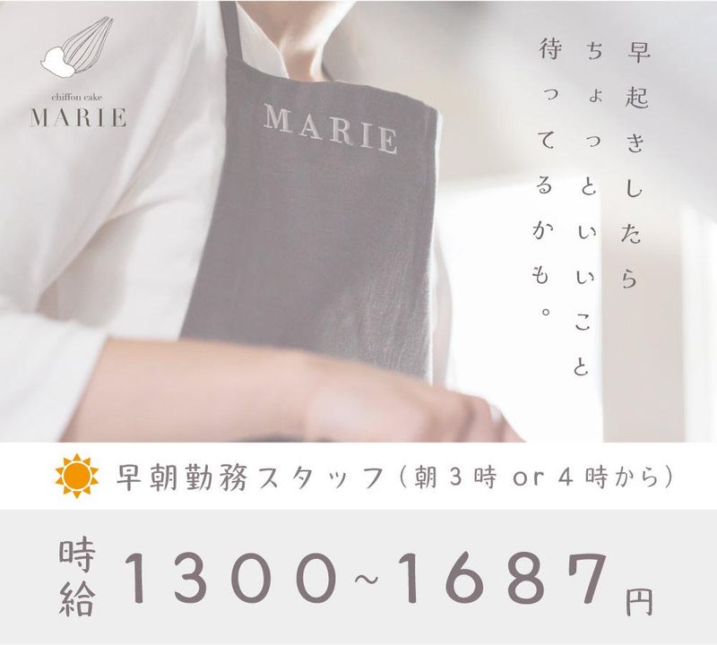 仕事内容 \ふわっと甘い香りに包まれて/ シフォンケーキの製造スタッフ♪ ⭐朝活派さんにぴったり! 3時 or 4時スタートで 午後はぜんぶ自由時間✨ ⭐現在約25名の女性が活躍中 20〜40代が中心の職場です ⭐駅チカ徒歩5分で通勤らくらく♪ 自転車・徒歩でも通いやすい◎ ⭐お菓子作り未経験でもOK! 丁寧な研修でしっかりサポート ⭐広〜い休憩室もあります♪ 足を伸ばしてリラックス ⭐やさしくて頼れる先輩ばかり 安心して長く働ける環境です <お仕事内容> ・材料の準備や洗い物など ・柑橘ジャムの手作り作業も♪ ・ふわふわシフォンを一緒に製造! 作業中は好きな音楽もOK♪ みんなで楽しく働いています! ⭐わからないことはすぐ聞ける! 未経験でも2週間~1ヶ月で慣れます◎ \「笑顔になれるお菓子作り」/ 市内で3店舗展開の人気店です 【こんな方にぴったり】 ・洋菓子に関わるお仕事がしたい方 ・朝の時間を有効活用したい方 ・お菓子作りが好き or 興味がある方 【雇用形態】アルバイト・パート 【職種】製造STAFF 【給与】時給1300円〜 あなたの「好き」をお仕事に♪ ご応募お待ちしています