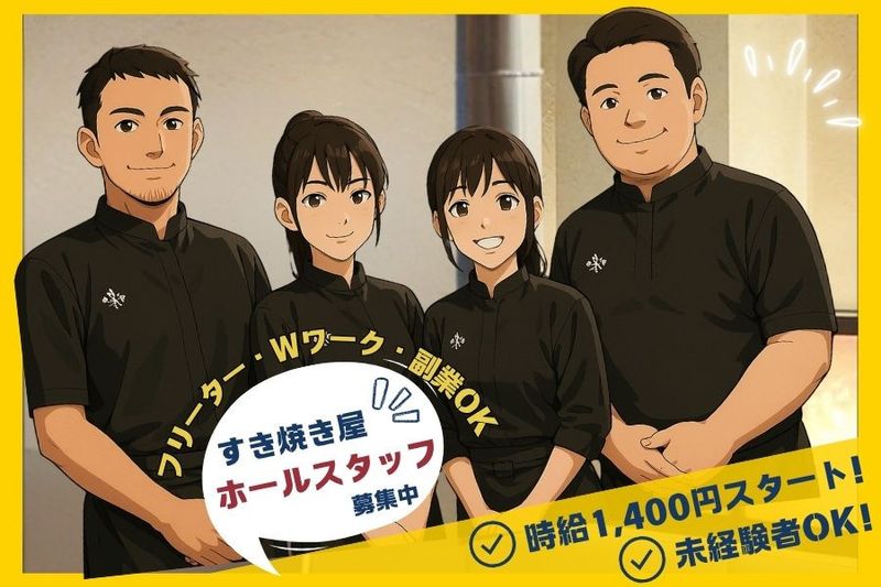 【仕事内容】 ⭐キレイで落ち着いた空間で、自分らしく働けるチャンス! 「和牛すき焼き浅草ぱんが」のホールスタッフとして、新しい一歩を踏み出しませんか? 堅苦しいルールは一切なし。 服装・髪型自由で、自分らしさを大切にしながら働ける環境です! シフトも柔軟なので、Wワークやフリーターの方にもピッタリ⭕️ 【ココで働くおすすめポイント】 ■時給1,400円スタートでしっかり稼げる! ■週1日・1日3時間~OK!自由度の高いシフト! ■頑張り次第で社員登用⭕️将来を見据えて働ける! ⏩️具体的な業務内容 ホールスタッフ業務をお任せします。 ・接客 ・配膳 ・ドリンク作り ・その他付随する業務 最初は基本から一緒にスタートしましょう! ================= ✅WワークやフリーターさんもOK⭕️ 働きやすい柔軟シフト! ================= 「空いた時間で効率よく働きたい」 「他の仕事と両立したい」 そんなあなたのライフスタイルにしっかりフィット! 週1日・1日3時間~働けるので、無理なく、でもしっかり稼げる柔軟な働き方ができます。 ============== ✅未経験でも安心! 頑張りはしっかり評価します! ============== まずはアルバイトからスタートし、希望や頑張りに応じて、社員登用のチャンスもあります! 「安定した働き方に切り替えたい」そんな想いにも応えます✨ 【求人ID-YUA】