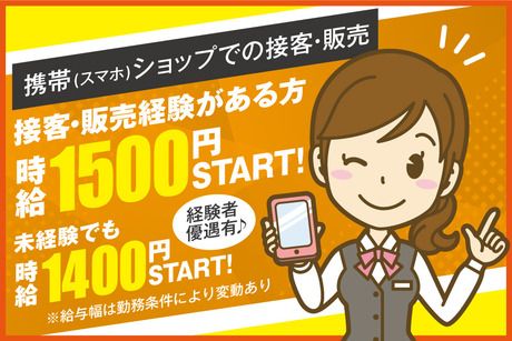 資格 ◆商品、業種問わず販売経験がある方優遇! ◆業界未経験OK ◆20代30代の男女スタッフ活躍中 ◆フリーター大歓迎 ◆どの携帯キャリアを利用中でもOK! 【こんな人にぜひ♪】 *人と話すことが好き *スマートフォン・携帯電話に詳しい *接客販売経験を活かして働きたい *仕事を辞めて、より稼げる高時給の販売ワークを探している方 *アパレルショップや食品、雑貨などの小売店で販売スタッフ、接客販売の経験がある方 *受付や案内スタッフなどの接客業の経験がある方