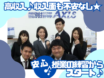 求めている人材 <こんな方に特におススメです> ・「教える」事が楽しめる方 …「個別指導」ならでは! 近い距離で丁寧に授業ができるので、 やりがいや楽しみもバッチリ♪ ・稼ぐだけじゃなく、合わせて自己成長もしたい方 学生生活!就活!将来!Axisのアルバイトはどこでも役立ちます! 例えばゼミでのプレゼン、就活での面接など♪ 社会に出た後も「教える(伝える)」という場面には必ず出会うため、 あなたの人生にとって役立つ事間違いなし! ・幅広い交友関係を作りたい方 授業中は基本的に1人で教えるものの、 つながりは多く教室長や先輩はもちろん、講師仲間もたくさんできます♪ 授業に関する話や、異なる学校の情報など、公私ともに充実しますよ♪ <学生・社会人・主婦(夫)さん活躍中!> ※教員免許をお持ちの方歓迎! ※講師など指導経験がある方もぜひ! *経験不問/未経験者歓迎・第二新卒歓迎 *資格不問/無資格歓迎・ブランク歓迎 *アルバイト・パートデビューの方でも大丈夫! *Wワーク歓迎(副業OK) *ハローワークでお探しの方も歓迎 *転勤なし *U・Iターン歓迎 ★家庭教師や学習塾、公文、塾などの勤務経験がある方は スムーズに慣れて頂けるかと思います!