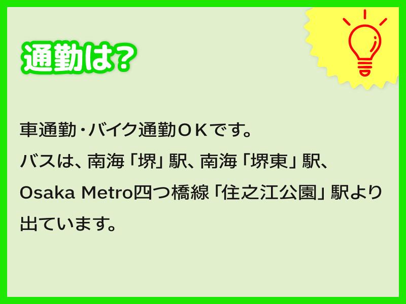 アクセス: * 車通勤OK/ バイク通勤OK * 南海「堺」駅と南海「堺東」駅、Osaka Metro四つ橋線「住之江公園」駅よりバスが出ています。 * 南海「堺」駅:南海バス16系統・17系統 北循環線「Jグリーン堺南口」バス停を下車(所要時間は約20分)、70系統「Jグリーン堺クラブハウス前」バス停を下車(所要時間は約15分)※70系統は土日祝のみ運行 * 南海「堺東」駅:南海バス16系統・17系統 北循環線「Jグリーン堺南口」バス停を下車(所要時間は約25分)、70系統「Jグリーン堺クラブハウス前」バス停を下車(所要時間は約25分)※70系統は土日祝のみ運行 * Osaka Metro四つ橋線「住之江公園」駅:南海バス91系統 「堺浜北」バス停を下車(所要時間は約15分)、71系統「Jグリーン堺クラブハウス前」バス停を下車(所要時間は約15分)」