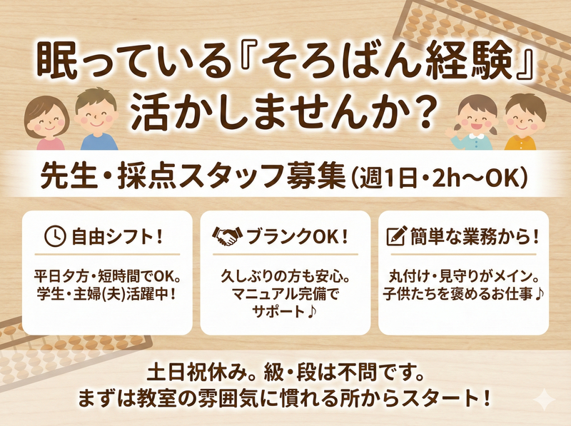 仕事内容 ✨時給1200円~!高時給で効率よく稼げる ✨週1日・1日2h~OK!シフトは自由自在 ✨「昔習っていた」その経験が輝く仕事 \眠っている「特技」を活かしませんか/ パチパチという懐かしい音と、 子供たちの真剣な眼差し。 「昔、そろばん教室に通っていた」 「段や級を持っているけど使っていない」 そんなあなたにこそ、 お願いしたいお仕事です。 指導のプロである必要はありません。 子供たちに「そろばんの楽しさ」を 伝えてくれる方を募集しています! 【具体的な業務内容】 ✅プリントの丸付け・採点 ✅指使いや姿勢のアドバイス ✅子供たちの見守り・声掛け ✅片付けなどの簡単な教室運営補助 「先生」と身構えなくて大丈夫。 まずは丸付けをして、 「正解!すごいね!」と 褒めてあげることからスタートです。 【入社後の流れ】 まずは教室の雰囲気に慣れる所から。 マニュアルも完備しており、 社員が常に近くでサポートします。 ブランクがあって当然です。 少しずつ勘を取り戻していきましょう。 大学生スタッフも活躍中です! ■採用担当者からのメッセージ 勤務時間の制限をなくし、 より働きやすい環境を整えました! 「授業終わりの夕方から」 「家事の合間の短時間で」 あなたのライフスタイルに合わせて 無理なく働いていただけます。 久しぶりのそろばん、 触ってみると楽しいですよ。 ご応募お待ちしています!