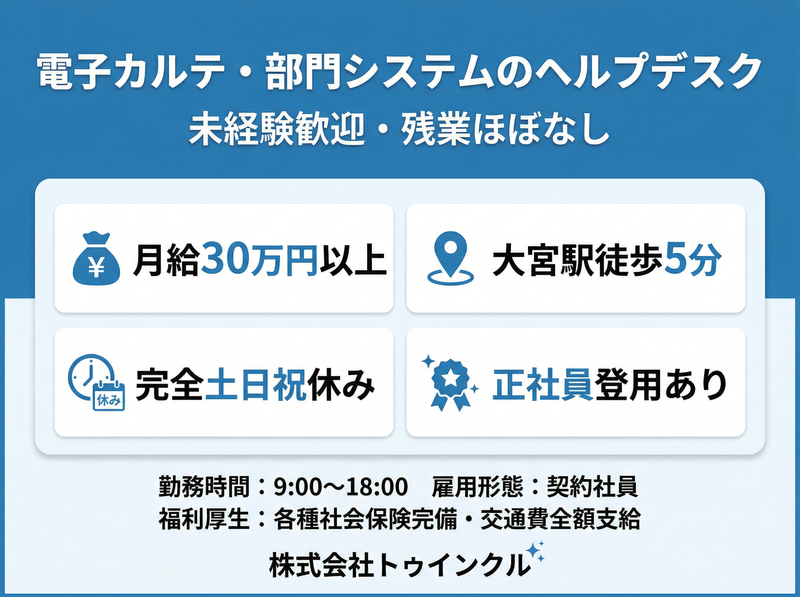 仕事内容: 病院で使われている電子カルテや部門システムに関する、問い合わせ対応・保守業務をお任せします。 医療現場のIT環境を支える、やりがいのあるポジションです。 <具体的な業務内容> 電子カルテシステム・周辺部門システムの操作方法に関する問い合わせ対応 エラー発生時の状況確認・原因の切り分け システムベンダーへのエスカレーション(二次対応の引き継ぎ) 問い合わせ内容の記録・管理(専用システムへの入力) プリンターなど周辺機器の管理・簡易メンテナンス <入社後の流れ> 現場責任者によるOJT研修があります。業務の大部分に手順書が整備されているため、 未経験の方でも安心してスタートできる環境です。