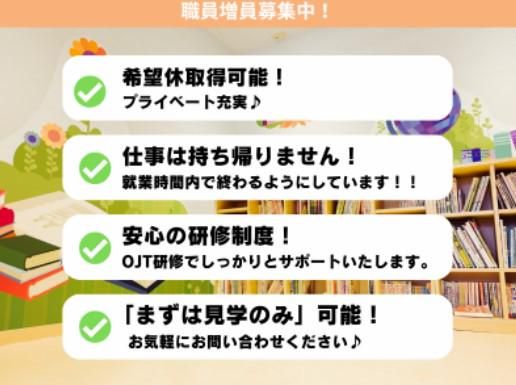 求めている人材 <必須条件>* 下記のいずれかの資格または経験をお持ちの方 ・保育士 ・幼稚園教諭 ・小中高教員免許 ・社会福祉士 ・精神保健福祉士 ・2年以上児童福祉事業に従事した方 ・児童福祉施設の職員を養成する学校その他の養成施設を卒業した方 ・大学で社会福祉学、心理学、教育学、社会学を専修する学科 またはこれらに相当する課程を修めて卒業した方 *<優遇条件>* 普通自動車運転免許 *☆こんな方のご応募お待ちしております!* ・お子さまが大好きで、一緒にいると笑顔になる方 ・職員みんながチームになって、よりよい教室をつくっていきたい方 ・主婦(主夫)の方、歓迎!(子育て中の方も活躍中です) ※学歴不問 ※児童発達支援・放課後等デイサービスでの勤務が未経験でも構いません ※未経験~ベテランの方までご応募歓迎! ※保育士としての経験が5年以上ある方は優遇いたします!