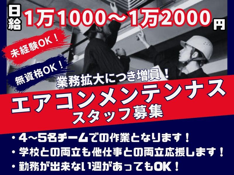仕事内容 ■■■自由シフト×日給保証!■■■ ■■■■■未経験OK!!■■■■■ <お仕事内容> 商業施設やオフィスビルなどに設置されている「業務用エアコン」の ・フィルター交換 ・点検補助 ・洗浄作業のサポート をお願いします。 また、車両基地での機械メンテナンス補助作業もあります。 難しい作業は一切なし! 常に4~5人のチームで動くので、未経験の方も安心してスタートできます。 先輩スタッフが丁寧に教えるので、知識ゼロからでもすぐに慣れますよ。 <働きやすさのポイント> ✅ 週1日から勤務OK!(シフト完全自由) ✅ 学校やプライベート、副業との両立もラクラク ✅ 芸能活動や夢と両立して働くスタッフも在籍 ✅ 「この曜日だけ働きたい」という相談もOK! ✅ 早く終わっても日給保証で安定収入 ✅ 制服は会社でクリーニングに出すので洗濯不要 ✅ 月2回の給与振込でお財布安心 <こんな方にピッタリ!> ●未経験から新しい仕事を始めたい ●短時間でもしっかり稼ぎたい ●副業・Wワークで収入を増やしたい ●学校や夢と両立したい学生 ●安定した日給制で働きたいフリーター 30代・40代・50代の男性スタッフが中心ですが、学生さんや副業ワーカーも多数活躍中!