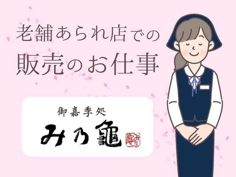 仕事内容 *未経験歓迎 *20~40代の女性活躍中 *1日5h~×週3日~勤務OK *老舗のあられ店で安定勤務 *近鉄四日市駅~徒歩1分 / 洗練された接客マナーが身につく 販売スタッフ \ 「子どもの手が離れたから お仕事復帰したい」 なんて方も大歓迎! ================= <仕事内容> 老舗のあられ店「み乃龜」で 販売・接客のお仕事をお願いします。 店頭での商品説明をはじめ、 迷っていそうなお客様へのお声かけや お会計の対応、試食を配るのも、 お任せしたいお仕事です。 お客様の層としては 高齢の方や富裕層のご婦人が多く、 贈答用としてご購入される ことが多いです。 当店では、 大きな声で話したりすることはなく、 明るいながらも落ち着いた 接客が中心です。 お客様とのやりとりを大切にし、 気持ちのこもった接客を期待しています! ――――――――――――――――― 久々の仕事復帰もご安心ください。 ――v―――――――――――――― 未経験の方やブランクがある方も イチから丁寧に教えしますので、 ご安心くださいね。 実際に、20~40代で 未経験から始めたスタッフが 多数活躍中です。