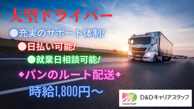 仕事内容 【 大型トラックでパンの配送 】 大手ファストフードチェーン向けのバンズ(パン)を届けるルート配送のお仕事です。 ◎仕事内容 ・10tトラックでのルート配送(大型免許必須) ・配送エリア:主に茨城県のセンター ・積み荷:パン専用ケース(番重)をドーリーで積載 ・配送件数:1日2便(積み込み・納品を2回) ・荷下ろし:納品先でテールゲートを使用して作業 ・高速道路使用有り ・構内ルール有り:スマホ・アクセサリー等の持込禁止 ◎おすすめポイント ・高時給1,800円+残業代全額支給 ・日払い、週払い制度有り(規定有り)で急な出費も安心♪ ・研修&マニュアル完備で未経験でも安心スタート ・大型免許を活かして安定収入が可能 ・大手グループ企業で福利厚生も充実 【シフト制】 ・お休みは基本的に月・水曜日の週休2日制 ※状況により月曜日の休日出勤を依頼される場合がございます(可能な場合のみでOK) 【職場の雰囲気】 20~50代の方活躍中!