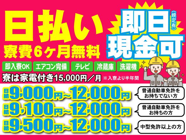 【保険制度】 雇用保険、労災保険、健康保険、厚生年金 待遇 ・社会保険完備 ・日払い・週払い可 (当社規定による) ・寮完備(即入寮可) ・駐車場完備 ・傷害保険あり ・運転手手当あり ・誕生日プレゼント ・髪型自由
