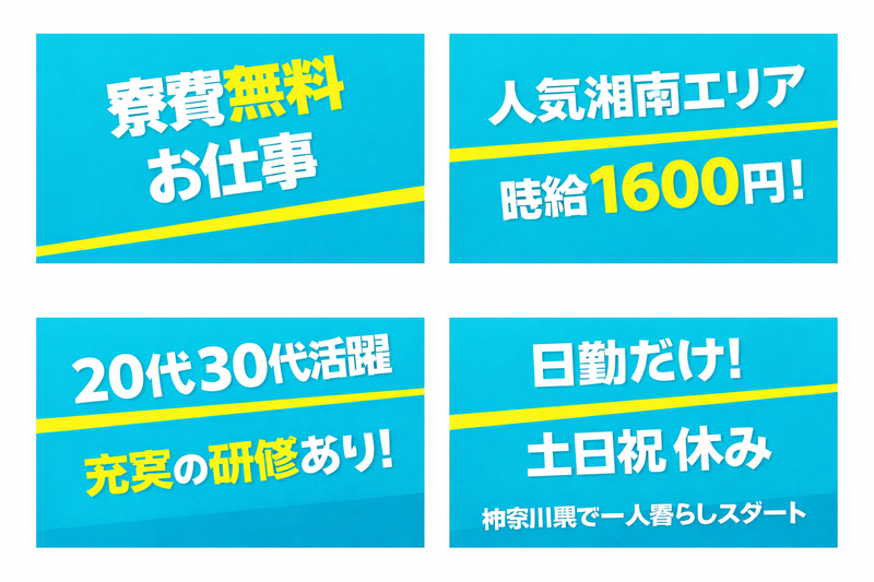 仕事内容 ▽▽▽▽▽▽▽▽▽▽▽▽▽▽▽▽ ☆充実の研修制度で安心スタート☆ △△△△△△△△△△△△△△△△ 入社日~約3か月間の研修制度あり 未経験者・経験者問わず実施しております。 使用する工具名や作業書の見方などみなさんが一人で作業できるように先輩社員がしっかりと教えてくれます。 作業も練習用の基板の組立てからスタートし、実際の作業に入れるよう長い時間かけて教えていただけます。 【日勤・土日祝休みの平日だけ】 平日の月曜日から金曜日までのお仕事になります。 しっかりと休暇もあり(年間休日125日)オン、オフはきっちりしています。 生活リズムを崩さず、土日祝はしっかりお休み。 プライベートと両立しながら、無理なく長く続けられます。 【社宅・寮費無料】 地域相場6万円(1K)に無料で住めちゃいます。 初期費用と年間家賃合わせて約100万円の節約が可能です。 近くのターミナル駅の大船駅か藤沢駅近辺に寮を用意しています。 休日には、みなとみらいへ買い物や湘南の海や江の島観光をしたり、鎌倉の大仏を見に行ったりと休日が満喫でき、プライベートも充実しています。 【仕事内容】 軽い電子基板の組立・配線作業をお任せします! 基板の組立の際、はんだ付け作業や配線作業では端子の圧着作業など慣れればシンプルなお仕事です♪ 未経験の方でも大手企業ならではの充実した教育システムでしっかりサポートしますのでご安心ください! ここがポイント! ✨ 大手企業勤務 だから安定した環境で長く働けます。 ✨ 寮費無料(初期費用なし、家電レンタルあり、各規定あり) 住まいは、横浜市・藤沢市・鎌倉市と神奈川を代表する地域で、買い物にも遊びにも最適な環境です。 ✨ 高時給1600円! しっかり稼げる! 研修後は多少の残業をお願いします。月によっては30万円以上の月もあるかも。 ✨ 未経験歓迎!特別なスキルや資格は必要ありません。 はんだに配線、ひとつひとつしっかりとした教育を行っておりますので、確実なスキルを身に付けることが可能です。 こんな方にピッタリ! ✅ 安定した職場で長期的に働きたい方 ✅ 新しい環境で心機一転スタートしたい方 ✅ コツコツ作業が得意な方 ✅ しっかり稼ぎたい方