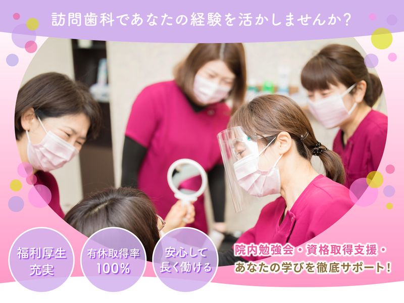 仕事内容 患者様のご自宅や介護施設にお伺いする訪問歯科診療で衛生士業務をお願いします! 具体的には、歯石除去や予防処置、歯磨き指導、メンテナンスなどがメインです。 また、診療器具の滅菌やカルテ整理、書類作成もお任せします! 診療車で訪問先を回っていきます。 先輩スタッフが優しくサポートしていきます! また、研修制度も充実しているので、ブランクのある方でも安心して働ける環境です◎ 分からないことはなんでも気軽に聞いてください♪ 患者様のご自宅、または介護施設にお伺いし、歯科衛生士業務をお任せします。 ~具体的には~ ●専門的口腔ケア・摂食嚥下リハビリでの口腔機能訓練等 ●診療用器具の減菌・消毒・準備 ●カルテ管理・書類作成 など 【教育研修】 新人研修あり 経験のある方は入社後は当院の診療の流れを見ていただき現場に入ってもらいます。 医院によって用意する器具や材料が違い戸惑いがでるとは思いますので、出来るだけスムーズに診療できるように丁寧にサポートさせてもらいます。