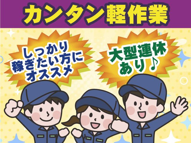 仕事内容 <注目ポイント> ・土日休み&長期休み ・月収例21万円以上可 ・空調完備で快適環境 ・正社員登用有 ・人気の日勤 【お仕事内容】 ピッキングのお仕事です。 指示された製品をピックアップ して箱詰めするだけの単純作業です。 ピッキングや梱包未経験の方も多数活躍中! 【アピールポイント】 作業服貸与あり 工場内に喫煙スペースあり 空調完備 長期連休あり 正社員登用あり <充実のお休み> 土日祝お休みで働きやすい! 夏期、冬期休暇などの長期休暇もあります。 ご家族やご友人との予定も立てやすい! <こんな方を募集> ピッキングや倉庫内作業に興味がある方 発送や梱包といった動きのあるお仕事をお探しの方 20代~50代までの幅広い世代の男女 収入アップしたいフリーターの方、 日勤で働きたい主婦(夫)の方、 体に無理なく働きたいミドル世代の方、 おすすめのお仕事です! パート・アルバイトからの転職もOK! 現在20代~50代の男女活躍中です。