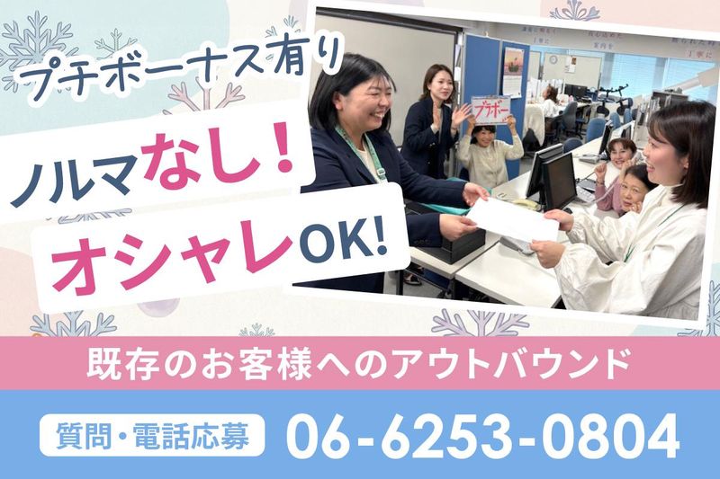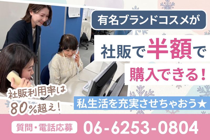 仕事内容 \ “美活”しながら働こう! / 「忙しい毎日でも、キレイでいたい。」 そんな気持ちを大切にできる、 主婦(夫)さんのためのお仕事です♪ *取り扱うのは話題のコスメや コラーゲンドリンク、サプリなど! *ノルマはありません! ムリなく自分のペースで働けますよ *発信のコールスタッフですが 既存のお客様へのご案内のみ! お客様の時間に合わせて発信するので ほとんどクレームありません! もし怒られそうになっても すぐに先輩社員が対応するので 自分一人で解決しなくて大丈夫です♪ *電話応対したことがない方でも安心! 先輩や社員がしっかりサポートします! 社割で人気コスメもお得にゲット★ 好きなことを仕事にしながら、 自分磨きもできると大人気(*^^*) 電話応募優遇 06-6253-0804まで! 面接はたったの1回のみ* お子さんの同伴も可能です! 子育て中の方もお気軽にお越しください♪ <未経験OK!経験者は尚歓迎です!> コスメの商品説明を行っていただくので 美容好きには必見のお仕事です! 1週間毎にシフトを決められるので 予定が入ってもギリギリまで変更可能* 「Wワーク・扶養内で働きたい方」 「コスメ・サプリに興味のある方」 そんな方にピッタリのお仕事です! <お仕事内容> コールセンターでの非対面での コスメ・サプリの案内をお任せします! 商品を購入頂いたお客様に お電話で商品のご案内をするだけ! <お仕事のメリット> \先輩スタッフに聞いてみました/ *シフトが直近7日ごとに提出でOK! 予定がかなり組みやすい! *コスメなど有名な商材なので 自信を持って案内ができる! *コスメが社販で半額で購入できる! (社販利用率は80%超え!) *PC操作が無い!入力作業も無く、 ボタンひとつで電話もかけられるので 覚えることが少なめ!‥‥など! 事務スタッフデビューした先輩も多数* 30代・40代・50代のスタッフが活躍中 <研修制度あり> 研修内容:座学・動画・録音データ・ロープレ等 電話をかけ始めたあとも 管理者がつきっきりで指導! \ こんな地域から勤務しています! / 大阪市中央区や西区はもちろん、 堺市や大阪市旭区、奈良県でも30分前後で 通勤できるので働いている方も多数! \ 夢を追いかけたい方も必見! / 俳優の卵など…夢に向かって頑張る スタッフも多数活躍中! ★声優の専門学生 「東京との行き来が多く、その資金を貯めるために働き始めました」 …などさまざまな理由で在籍されています◎ 皆さん長期で勤務されている方ばかりです! ぜひ一緒に働いてみませんか?
