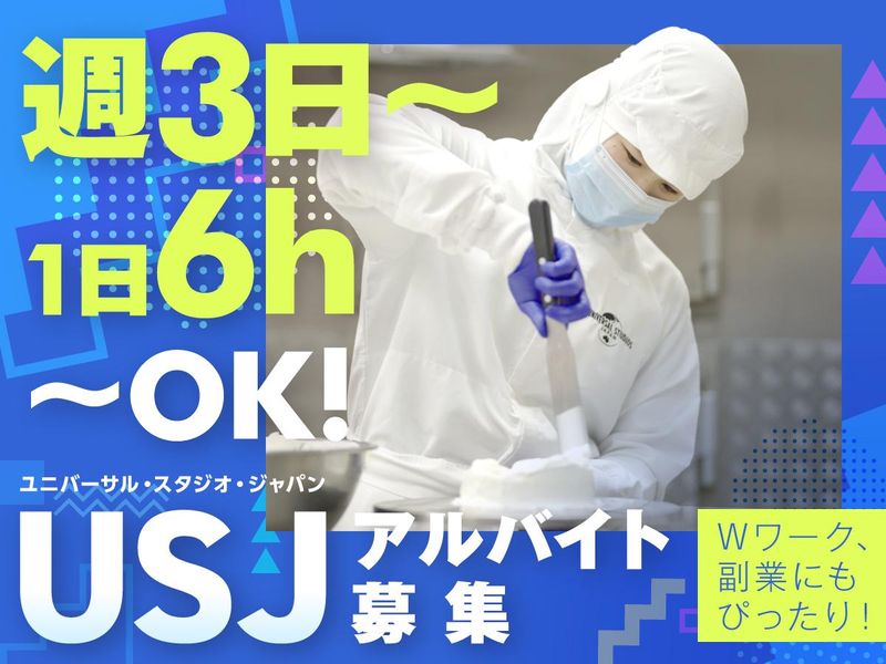 仕事内容 ユニバーサル ・ スタジオ・ジャパンで ワクワクドキドキをゲストにお届けする セントラルキッチンでの調理や 下ごしらえを行うクルーを大募集⭐ ✅USJテーマパーク内の専用施設! レストランで提供される料理の材料チェックや 下ごしらえ、調理をお願いします◎ ケーキを焼いてデコレーションしたり パンを成型して焼いたり チームに分かれて商品ごとに協力して作っていきます! お料理が好き、お菓子作りが好き という方にピッタリなお仕事です♪ ✅週3〜5日、6〜8h勤務 平日メイン、土日メイン Wワーク・副業など働き方の相談可◎ ✅クルーだけの特典たくさん 無料招待券や割引チケットの配布 クルー限定パークイベントもあり♪ 他にも、従業員食堂の割引、 勤務時間に応じたマイレージボーナスなど 長く働くほど働くとお得な特典がいっぱい!