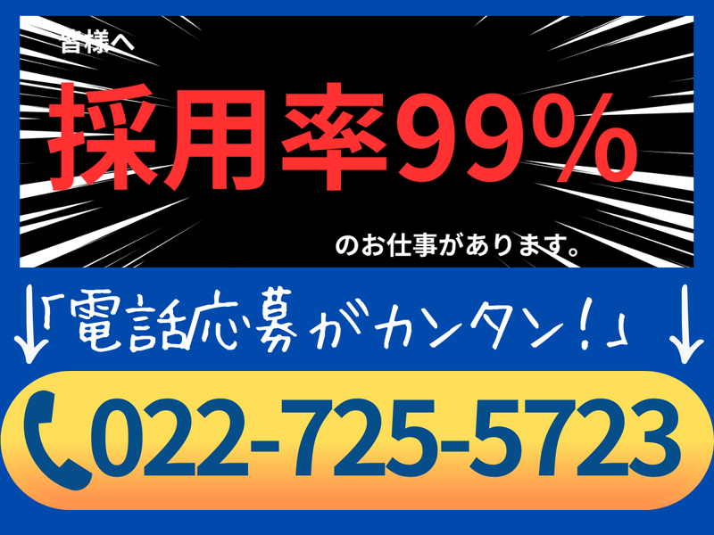 選考プロセス \選考について/ 電話応募(※推奨) 「作業員の募集を見た」と言ってください。 TEL:022-725-5723 WEB応募 →応募確認後にお電話またはメールにてご連絡します。 【応募】⇒【面接】⇒【内定】 面接時の服装は私服で問題ありません。 面接時、履歴書不要です。