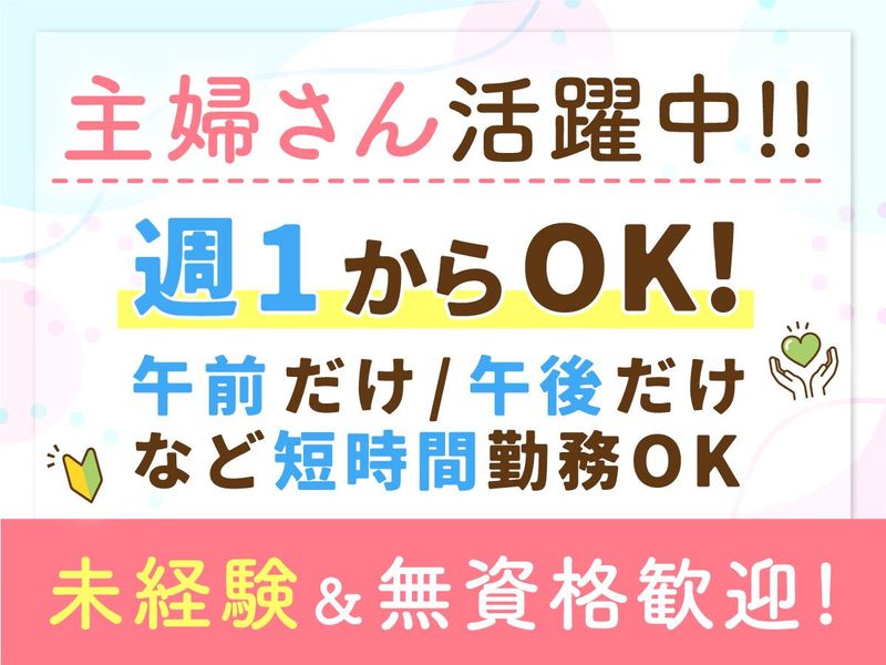 仕事内容 \ 女性スタッフ・主婦さん活躍中 / 体力的な負担が少なく、 見守りや声かけが 中心のデイサービスです♪ -*-・-*-・-*-・-*-・-*-・-*-・-*-・-*- デイサービススタッフの募集…ですが 介護のイメージ、ここでは一切不要!! 「見守り中心」で未経験も始めやすい♪ 入浴・食事介助、一切なし! 午前のみ/午後のみなど短時間勤務OK 週1日~OKでムリなく続けられる ✅時給1400円で効率よく収入GET◎ 介護に関わる資格は必要ありません! *。・―――――――――――――――・。* 介護というよりは、 「運動の付き添い」「声かけ」「見守り」 が中心で、利用者さまは元気な方が多め◎ 体力的な負担は少なめですので、 未経験から始めたスタッフも多数活躍中 *。・―――――――――――――――・。* 【 お仕事内容 】 リハビリ型デイサービスでの サポート業務をお任せします。 ・運動器具までの付き添い ・運動中の見守り・声かけ ・安全に使用できているかの確認 ・施設内でのかんたんなサポート ・トレーニング内容の記録・報告 ・利用者さまの送迎 など ※入浴・食事介助はありません ――――――――――――――― \\ いちおしポイント //  ̄V ̄ ̄ ̄ ̄ ̄ ̄ ̄ ̄ ̄ ̄ ̄ ̄ ̄ 利用者さまは軽い運動を問題なく行える 元気なおじいちゃん、おばあちゃんが中心♪ 「介護=大変そう」 というイメージとは違い ◎手を引いて歩く ◎声をかけて見守る ◎そばで安全を確認する といったサポート役がメインなので、 未経験の方やブランクのある方も 抵抗なく始められる職場環境です。 ・午前働いて、午後は家事や自分の時間に ・午後勤務でも16:30に終了するので、 帰りに買い物をして夕飯づくりも◎ ・「子どもが帰ってくるまでの時間だけ」 そんな働き方も可能です◎ 週1日~/午前だけor午後だけもOKなので 家事や育児、プライベートと両立しながら ムリなく続けられるのも魅力のひとつ☆ ――――――――――――――― \\ しゅふさん活躍中 //  ̄V ̄ ̄ ̄ ̄ ̄ ̄ ̄ ̄ ̄ ̄ ̄ ̄ ̄ ・家計の足しに ・お小遣い稼ぎに ・久しぶりのお仕事復帰に ・スキマ時間を有効活用したい方 ・長時間勤務はちょっと不安な方 ・人と関わる仕事がしたい方 ・人の役に立つ仕事がしたい方 そんな方にぴったりのお仕事です☆ 未経験から始めたスタッフも多数活躍中!