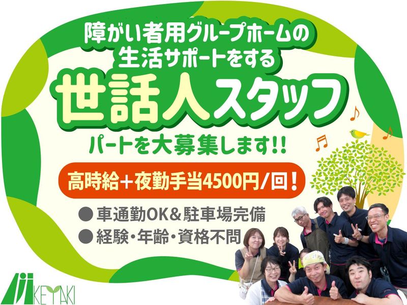 仕事内容 *未経験でもブランクありでもOK *高時給+夜勤手当4500円/回! *昇給&年2回の賞与支給あり *制服貸与&髪色やネイル等OK *人の支えになる仕事をしたい方に ================ ――――――――― ⏩ お願いする仕事 ――――――――― 障がいのある方が 共同生活を送るグループホームにて 生活サポートをする世話人を募集! 主な業務は… ■入浴介助 ■見回り ■送迎(ホーム~作業所) ■トイレ介助 など ✨未経験でも大丈夫です✨ 利用者さん一人ひとりに合わせた わかりやすい支援を心がけています。 福祉の仕事の経験がない方でも、 久しぶりに働くという方でも、 スタッフが丁寧にサポート! わからない時や困った時は お気軽にご相談ください。 ✨落ち着いた環境で安心✨ 利用者さんは日中は作業所や デイサービスに通っており、 ホームにいる時はTVや雑誌を見て くつろいでいることがほとんど。 ここでの暮らしも10年以上たち、 リラックスして過ごしています。 余暇時間は利用者のみなさんと トランプやオセロなどをして、 ワイワイ楽しく過ごしてOK! ✨夜中心で高収入です✨ 勤務時間は曜日を問わず、 夕方16時~翌朝9時 ┗夜間は休憩(睡眠)できます◎ ┗実質8時間勤務 時給1250円に加えて 夜勤手当1回4500円以上あり! さらに通勤手当はもちろん、 資格に応じた手当や 実績による賞与も支給します。 ================ ――――――――― ⏩ こんな方が活躍 ――――――――― 子育てが一段落した主婦(夫)さんや 夜のWワークにしたいフリーターさん、 福祉の資格を活かして稼ぎたい方など さまざまなスタッフが在籍中。 勤務日数や曜日は応相談です。 まずは一度お話ししましょう! ================ ―――――――― ⏩ 当会について ―――――――― 社会福祉法人けやきの会は グループホームの運営のほか、 障がいのある利用者さんが 部品の組立や縫製の仕事で働ける 作業所も手掛けています。 利用者さんの意欲や能力の向上と 生活面での自立を目指して これからも様々な活動を予定。 当会にご興味のある方は 下記HPもご覧ください! ▼▼公式HP▼▼ https://keyaki-no-kai.jp/ ================