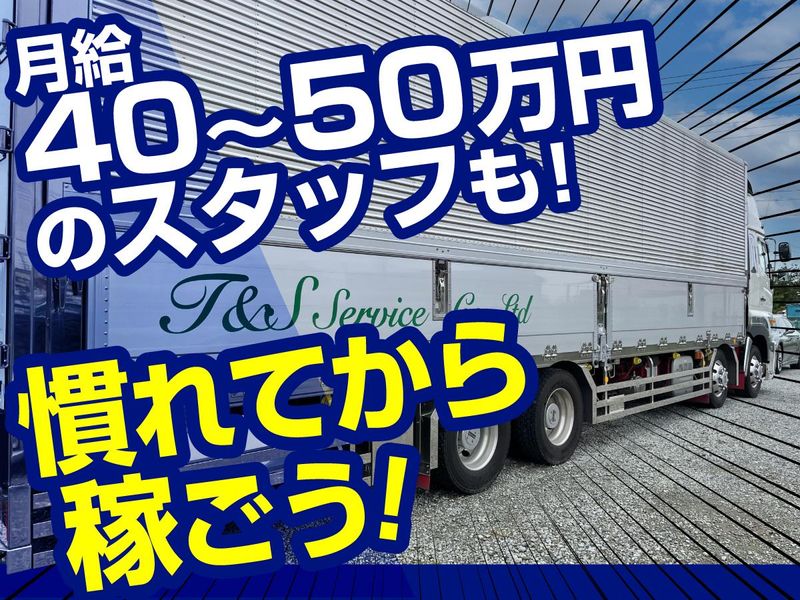 仕事内容 ____________________ 40〜50代の“初めてのドライバー転職”が多数  ̄ ̄ ̄ ̄ ̄ ̄ ̄ ̄ ̄ ̄ ̄ ̄ ̄ ̄ ̄ ̄ ̄ ̄ ̄ ̄ 難しい作業なし!同年代が丁寧に教えます! 最後の転職先として選ばれています。 「今の仕事、このままで大丈夫かな…」 「未経験でドライバーに挑戦したいけど 年齢が気になる…」 そんな不安を抱えた40代・50代の方から 選ばれているのが、当社T&Sサービスです。 体への負担が少なく覚える作業もシンプル。 未経験で入社して、 「もっと早く転職すればよかった」 と話すスタッフが本当に多い職場です。 もちろん“頑張った分だけ収入アップできる” のもこの仕事の魅力。 未経験スタートで月給40~50万円を 実現しているスタッフも多数います。 -【仕事詳細】- 食品・飲料、雑貨・建材などの配送を行う 中型ドライバーです。扱う荷物は比較的 軽めで、体への負担が少ないのが特徴。 ▼配送エリア 中長距離(東北〜九州)のフリー配送。 地場配送(近距離)を選択することも可能。 生活スタイルや自分のペースに合わせて 働き方を選べます。 ▼未経験でも安心! 最初の1ヶ月は同乗研修で丁寧にサポート。 “積み込み→運転→納品”のシンプル作業。 1人作業なので気を遣わず淡々と働けます。 「覚えることが多そう…」と 心配する方ほど、安心して働ける環境です。 -【こんな40〜50代が活躍中!】- ●異業種からの転職 (工場・営業・建築・製造など) ●「大型に憧れていた」という未経験者 ●「最後は安定した仕事を」と入社した方 ●ブランク明けで不安だったスタッフ →実際に40代後半~50代前半の 未経験入社が多数活躍中! -【選ばれているポイント】- ✅体への負担が少ない・無理のない働き方 無理な量の荷物はなく、年齢を重ねても 続けやすい配送です。 ✅“1人1台”の専用車両でストレスなし 最新車両も多数導入しています。 ✅未経験でも月給40~50万円が可能 「まずは慣れて、徐々に収入アップ」を実現 高収入を目指す方は中長距離・フリー便、 自分のペースでという方は地場配送など 働き方の選択ができます。 ✅40〜50代でも新しい挑戦ができる 同年代の先輩が多く、馴染みやすい雰囲気! ✅寮完備 生活面の不安がある方もご相談ください。
