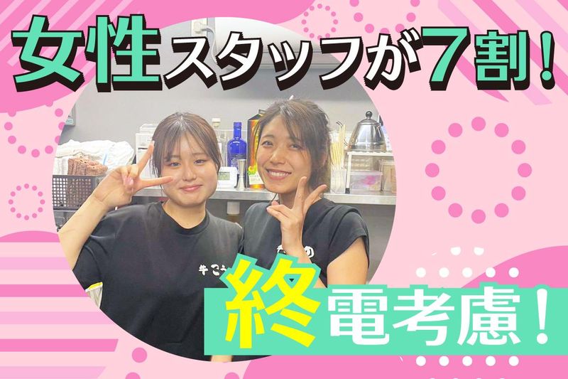 仕事内容 「焼肉屋さんは体育会系」 そんなイメージはなくなります! ✼┈┈┈┈┈┈┈┈┈┈┈┈┈┈┈┈┈┈✼ 🌸 匂いがつかない! 強力ダクト完備!! バイト後にそのままデートや女子会へ 行ってもバレません(笑) 🌸 オシャレは我慢しない! 髪色ピンク、派手めのピアス …「今の自分」を否定しない、 自由なスタイルで働けます! 🌸 復活当選、おめでとう! 急な遠征も相談OK◎ 「推しのライブが当たったから今週は 休みます!」 「遠征費稼ぎたいから来月はガッツリ週5」 …そんなワガママも笑顔で送り出します。 ✼┈┈┈┈┈┈┈┈┈┈┈┈┈┈┈┈┈┈✼ 初バイトでも安心して始められる "ほっこり温かい" 雰囲気が特徴の焼肉屋さん お任せすることはとってもシンプル★ *お客様ご案内 *オーダー取り *ドリンク・料理の提供 *レジ *洗い場 *簡単な盛り付けなどの調理補助 ホールとキッチンの距離が近く、 分からない時はすぐ聞ける体制なので安心感◎ マニュアルもあります! ほとんどのスタッフが未経験スタート♪♪ ✼┈┈┈┈┈┈┈┈┈┈┈┈┈┈┈┈┈┈✼ \ 大好評のまかない / A5ランク黒毛和牛のまかない「実質0円」 30年以上の経験を持つ店主が、 「今日もお疲れ様」と出してくれるお肉は 高級店ならではの味。 「良質なタンパク質で、 働きながら綺麗になれる…!?」と、 美容にこだわるスタッフからも大好評✨ ✼┈┈┈┈┈┈┈┈┈┈┈┈┈┈┈┈┈┈✼