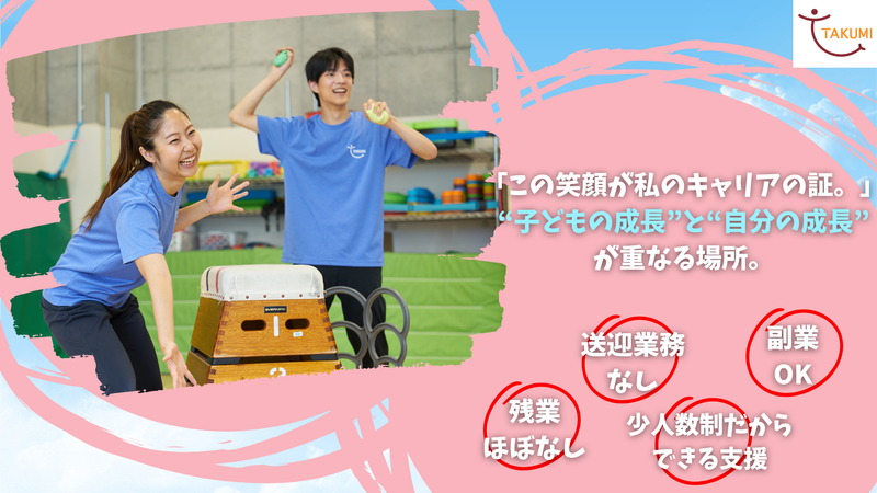 仕事内容 …………………………………………………… 求人のポイント …………………………………………………… ⭐未経験歓迎♪研修充実で安心スタート◎ ⭐残業少なめ!私生活も大切にできる♪ ⭐子どもたちの送迎業務はありません◎ ⭐年間休日約120日♪(昨年度実績) ⭐有給消化率80%以上! 未消化分は会社から再通知あり♪ …………………………………………………… お任せするお仕事は …………………………………………………… 児童発達支援事業・放課後等デイサービス TAKUMI(たくみ)にて、子どもたちの 成長のサポートをお願いします。 《具体的には》 ✅創作活動や運動のサポート ┗ お絵描きや折り紙をする際の補助 鉄棒や縄跳びなどの体育指導 ✅保護者様とのやり取り ✅TAKUMI(たくみ)体験会の実施 ✅自社サービスの周知活動 ┗ 地域の療育センターなどを訪問し、 広くPR活動を行います。 ✅資料作成 ✅創作活動の準備 ✅電話対応 など ☆1クラスにつき未就学児は5名以下、 児童の場合は10名前後になります。 ☆1コマは95分です。 ☆児発管とマネージャーが それぞれ在籍していますので、 ⼦どもたちの⽀援に集中できる環境です。 保護者対応もご安⼼ください♪ …………………………………………………… 1日の流れ(例) …………………………………………………… 09:30 業務をスタート! 09:45 事務作業や周知活動を行います。 11:00 ミーティング 受け入れる子どもたちのことや、 プログラムの内容共有をします。 12:00 昼食休憩 13:00 子どもたちが到着♪ プログラムを実施します。 (2コマ・3コマ) 17:45 全体ミーティング 1日を振り返ります! 18:30 業務終了。 お疲れ様でした♪ …………………………………………………… TAKUMI(たくみ)について …………………………………………………… 運動療育に特化したプログラムが 高い評価を得ている児童発達支援事業・ 放課後等デイサービスです。 年齢・個性・特徴などに合わせた 療育プログラムを行っており、 現在全国に28教室を展開しています。 【今回は新規OPENの教室での募集です】 子どもたちの自己肯定感や ポテンシャルを伸ばせるよう 自由に運動できる時間を設けているのが 特徴となっています。 《指導内容(例)》 ⏩バランス感覚を養うために遊具を活用 ⏩トランポリン運動で基礎体力を向上 ⏩マット運動や跳び箱、鉄棒 ⏩ダンスの練習 ⏩動物の真似をして、 楽しみながら取り組むトレーニング ⏩お絵描きや折り紙などの創作活動 など …………………………………………………… 充実の育成体制 …………………………………………………… 《OJT研修》 ■研修担当者による丁寧なフォローアップ ■スキルアップのための 社内ミーティングの開催など 《e-ラーニング研修》 ■座学研修 …TAKUMIの療育方法など ■基本的なビジネスマナーの研修 ■各種ハラスメント研修 ■運動実施研修 ■全社員研修 ■都市区町村主催の研修 …………………………………………………… お仕事のやりがいはここ! …………………………………………………… 「昨日までできなかったけど、 今日はできるようになった!」 子どもたちの喜ぶ笑顔や日々の成長を 間近で見られるのはとても嬉しく、 大きなモチベーションとなっています。 残業も少なく、お休みもしっかり取れるので リフレッシュして仕事に取り組めるのも 魅力のひとつ。 また、風通しが良く自分の考えを 発言しやすい環境なので、より良い サービスを実現することができます。 ⏩キャリアアップの道もご用意! ―――――――――――――――― ✅教室マネージャー ✅エリアマネージャー ✅児童発達支援管理責任者 ✅コンプライアンス室 など 興味がある分野をスキルアップしたり、 新しいことにチャレンジすることなどが 可能な環境です。 …………………………………………………… 今回は関西の教室での募集です! …………………………………………………… ◆堺教室 ◆西宮教室 ◆天王寺教室 ◆高槻教室 ◆神戸住吉教室 ◆吹田教室<2026年3月OPEN予定> ◆塚口教室<2026年4月OPEN予定> 勤務地はあなたの状況・希望を考慮します! ⏩各教室の住所は当社HPをご参照ください。 https://initias.co.jp/school/ ⏩転居を伴う転勤はありません