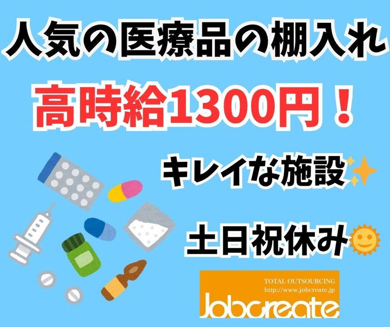 仕事内容 No.60419 ★人気な病院での勤務 ★駅チカ案件 ★嬉しい空調完備 ★当社オープニングスタッフ ★未経験歓迎 病院内での商品の棚入れ 簡単なPC入力作業 ◇お仕事内容◇ 病院内での医療品の棚入れ作業などをしていただきます! その他、医療品の搬送作業や簡単なPC業務などもあり 男性活躍中の現場となります☆ 病院内での勤務募集は珍しく もちろん空調完備でキレイな施設内ですので 環境は整っております☆ また、就業前に営業担当者と 現場の見学をしていただけます! 作業内容や職場の雰囲気もみていただけるので安心♪ まずは見学へ一緒に行ってみませんか?❀ ◇アピールポイント◇ 病院内での勤務 未経験歓迎 男性活躍中の職場 嬉しい空調完備 ◇職場環境◇ 病院内での勤務なので環境は整ってます 男性活躍中 ◇時間◇ 8:30~17:00(休憩60分)実働7.5時間 ◇月収例◇ 1300円×7.5時間×21日=204,750円+残業代+交通費全額支給 ◇休日◇ 土日祝 ◇交通費◇ まずは通勤方法をご相談ください! *公共交通機関の場合:原則 交通費全額実費支給 *車・徒歩・自転車相談OK ◇アクセス◇ JR環状線・近鉄・大阪メトロ 地下鉄鶴橋駅 徒歩約7分 *車・自転車・バイク通勤相談OK **-** リーチリフトの経験を活かせる♪ 直接雇用の実績もある会社さんです♪ マイカー通勤OKで朝もゆっくり出勤できます♪ 業績好調の大手企業でお仕事してみませんか? **-** ジョブクリエイトは 大阪府高槻市にある派遣会社です。 製造、倉庫内、梱包などの軽作業はもちろん オフィスワークや販売促進など 豊富な人材サポートを行っております! 阪急高槻市駅から歩いて3分♪ 来社不要のWEB面談も実施しております! ご希望の方はお気軽にお申し付けください☆ **-** <自宅から面接ができるWEB面接実施中> 来社不要のスマホ面接もございます! ご自身のPCやスマホでご自宅からかんたんに面接♪ ▽WEB面接についてはこちら WEB面接は誰でも出来ますか? <apアプリポイントプレゼント!> 日々のお仕事でポイントがたまり、 日用品や家電、食品、旅行券などの 商品と交換していただけます! ▽apアプリについてはこちら 社内連絡専用メッセンジャーアプリについて ※土日祝日に頂いたご応募に関しましては、 翌営業日に順次対応させていただきます。 **-**