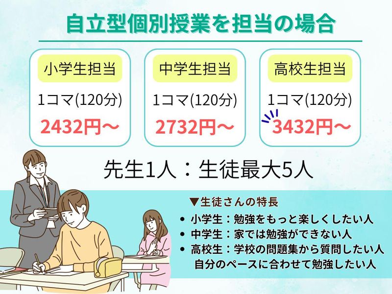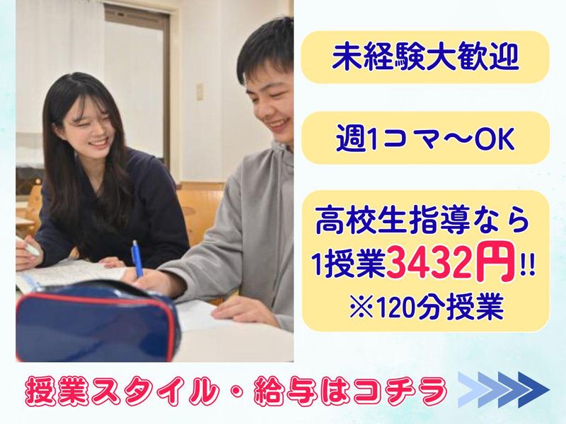求めている人材 <必須条件> ※大学生以上 週1コマ(授業)~/1科目でも教えることができれば大丈夫です かけもちバイトもOK◎ ※17時~勤務できる方 <こんな方是非!大歓迎> ★アルバイト・パート未経験 ★主夫・主婦パートさん ★家庭教師経験者 ★理数系が得意な方 ★英語・漢文・古文・いずれか得意な方 ★子どもが好きな方 ★学習塾への通学経験者 <スタッフについて> 頼りになる&気さくな大学生スタッフや先生ばかり◎ 「子ども達の成長の役に立ちたい!」という方大歓迎です! 「将来先生になりたい!」という志望動機で バイトを始めた大学生さんもいますよ。