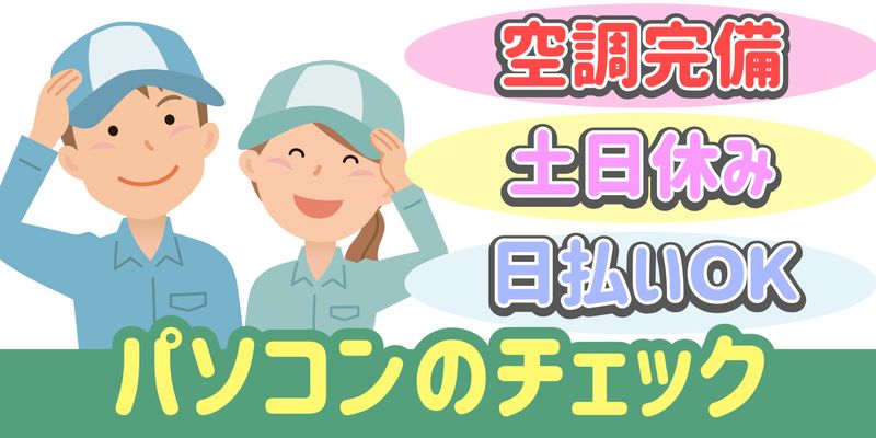 仕事内容 依頼書を見ながら、PCの不具合状況の確認を行うオシゴト ・改善できているかの最終チェック ・専用のシステムにかんたんなデータ入力 ~などもお願いします 未経験でも問題ナシ!丁寧に教えてもらえるので安心です 出張面接いたします!就業前の職場見学OK! ご応募お待ちしております! 25歳~40代後半の男女活躍中! ・就業先は児玉工業団地内 オススメpoint ・うれしい土日休み ・空調完備で1年を通してカイテキ ・午前、午後に小休憩あり お仕事の効率UP ・作業着はサイズがあれば貸与あり ・ロッカー完備 ・駐車場あり 車通勤OK ・お仕事の継続の見込みがある方は時給アップあり ・未経験OK ・パソコンの入力経験がある方 ・土日休みご希望の方 ・日勤のお仕事お探しの方 ・長期で働きたい方 ・1月あたりの平均残業時間40h ない時もございます 【こんな経験活かせます!】 パート、アルバイト、契約社員 雇用形態問わず、下記の経験ある方は活かせます! ・PC修理 ・検査 ・PC、データ入力 ・チェック ・発注 ※もちろん必須ではありません! まずはお気軽にご応募ください ///////////////////////////////////////// (WEBでご応募の場合) お電話番号を記入していただくと ご案内がスムーズです。 /////////////////////////////////////////