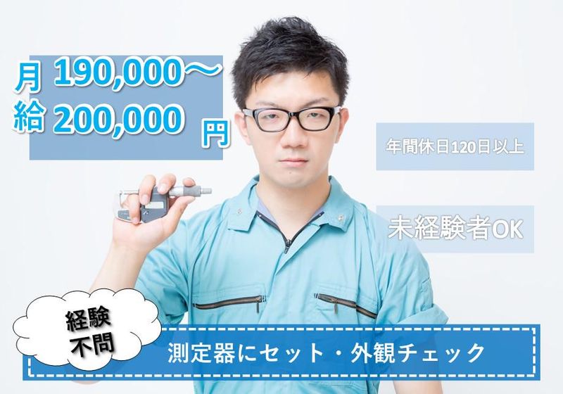 仕事内容 \\学歴不問!未経験OK// 愛知県「名古屋市港区」で、 航空機部品の検査スタッフ 正社員募集! ✅完全週休2日・土日休み ✅年間休日120日以上 ✅9~10日間の大型連休 ✅賞与年2回あり ✅社員食堂あり ✅30代・40代・50代の男女活躍中! 航空宇宙分野を手掛ける請負先企業で、 航空機部品の検査をお願いします。 検査といっても主にお任せするのは 測定器セットと外観チェックです。 ◎重いものを一人で運ぶことはなく、 クレーンや台車などを使うので 安心してくださいね。 ー★スキル・経験は不問!★ー 難しい検査ではなく測定器セットと外観チェック なので、未経験でも安心してください。 航空機検査に必要な知識は6ヶ月間ゆっくりと 万全のサポート体制で研修を行いますので ご安心ください! ー★ワークライフバランス◎★ー 完全週休2日制の土日祝休みで、 『年間休日120日以上』! 長期連休は各9日間程あります◎ お休みがたっぷりあるので、 プライベートも大切にしながら 無理なく働けますよ! ー★充実の福利厚生!★ー 安心して長く働いていただけるよう、 環境を整えています。 昇給・賞与はもちろん、 育児休暇取得や、結婚・出産祝い金、 永年勤続表彰、社員食堂、寮、 資格取得支援制度など 福利厚生を充実させています◎