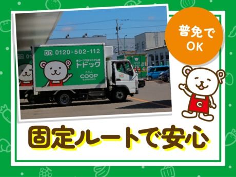 仕事内容 仕事内容について CMでおなじみ「宅配トドック」のサービス員です。食料品や日用品をお届けし、注文用紙の回収や季節商品のご案内もお願いします。 ~具体的には~ ●組合員様宅への商品(食料品・日用品)のお届け ●注文用紙の回収 ●季節・キャンペーン商品のご紹介 ●1日70件前後の固定ルート配送 ~入社後のフォロー体制~ まずは座学研修からスタート。その後、7週間の同乗研修で先輩がイチから丁寧に教えます 。最終テストに合格するまでしっかりサポートするので、未経験でも安心してくださいね !「本当に私にできるかな…」そんな不安がある方は、同乗体験も可能です!実際の仕事を見て、不安を解消してから応募を決められます 。荷物の積込み見学もOKです! 私生活優先OK!理想のバランス! 勤務は日勤のみで、毎週土日は必ずお休み!残業も月平均15時間と少なめです!「終業後の予定が立てやすい」と先輩にも好評!家族との時間や趣味も大切にできますよ! 運転が不安な方も「安心」の仕組み 運転するのは1.5tの小型AT車!普通免許(AT限定)でOK!全車バックビューモニター搭載の4WDで、安全面もバッチリ。決まった道 を走るので、土地勘がなくてもスグに慣れますよ! 将来も安心!安定とキャリア! 契約社員でも月給24万円の安定収入。さらに、頑張りは報奨金で評価!将来は正職員登用制度で、キャリアアップも目指せます!食品・日用品を扱うので、景気に左右されず業務量も安定してます! 暮らしを支える充実の福利厚生 社会保険完備はもちろん、育児休暇や時短勤務、看護・介護休暇制度も整備。ライフイベントを経ても長く働ける環境です!共済制度や慶弔見舞金など、もしもの時も手厚くサポート!