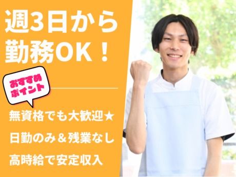 仕事内容 \ここがポイント/ ★無資格・未経験OK!介護業務にチャレンジできる♪ ★20~50代まで幅広い年代の男女が活躍中! ★週3日勤務~OK、日曜休みでプライベートも充実! *・。・。*・。・。*・。・。* <仕事内容> \★無資格・未経験からでも安心して始められる介護のお仕事★/ 介護施設で、利用者様の生活支援を担当します。 ・食事や入浴、排泄の介助 ・日常生活の見守りやレクリエーション支援 ・ご家族やスタッフとの連携、報告業務 *・。・。*・。・。*・。・。*