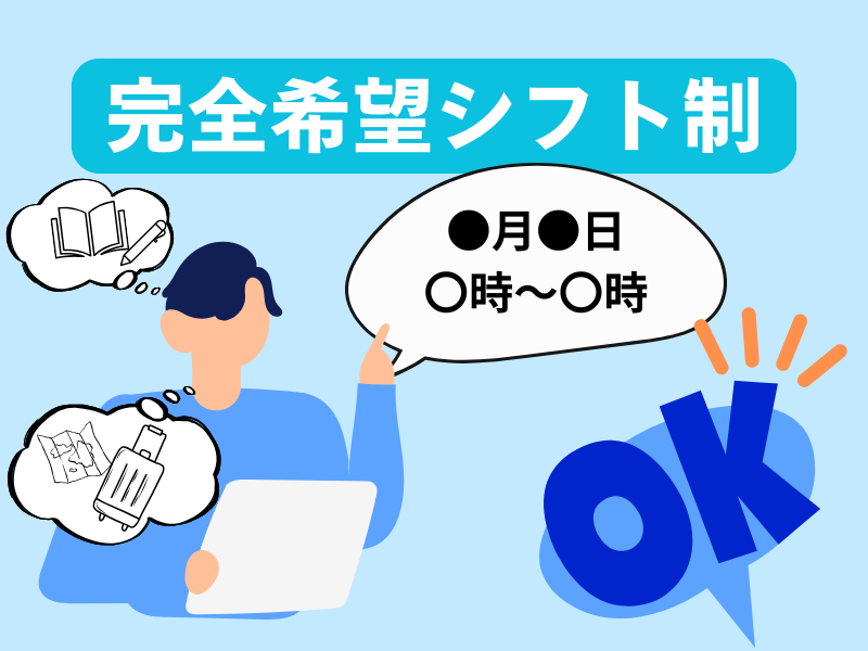 休日休暇 ◎シフト制ですのでご自身でお休みを決めれます。 ・年次有給休暇 ・年末年始休暇 ・慶弔休暇 ・産前・産後休暇 ・育児休暇 ・介護休暇