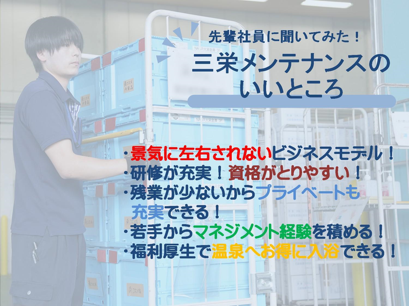 仕事内容 仕事内容 【成田空港と地域の「共存共栄」を掲げて50年】 ✨アピールポイント ✨ ✅賞与は3ヶ月分!月/残業20時間程度! (入社2年目の年収例) 大卒・大学院了 3,973,500円 短大・専門・高専等 3,688,143円 高卒 3,382,643円 ※全て残業月20時間程度、 賞与3.0ヶ月分含む ✅安定基盤×転勤なしで長く働ける 空港という巨大インフラを支える仕事 のため、景気に左右されにくく 安定性は抜群! 転勤もないため、 住み慣れた千葉・成田エリアで 腰を据えて働けます。 ✅未経験でも安心。 充実の研修と資格取得支援あり 入社時は特別な知識は不要です。 充実した研修と資格取得支援制度により、 文系・理系問わず 専門スキルを身につけられます。 ━━━━━━━━━━━━━━━━━━━ ✨具体的な仕事内容とその魅力✨ 成田空港および関連施設にて、 以下の業務を担当します。 ◆ 配送:空港の物流を支える 成田国際空港内のターミナルや売店への商品の配送を担当します。 ◆納品業務:化粧品、お酒、タバコ、お菓子など、 さまざまな商品を売店や施設へ安全に届けます。 ◆搬入・搬出作業:商品を効率的かつ丁寧に運搬し、 売場の陳列や整理をサポートします。 ◆在庫管理サポート:商品の数量確認や補充、 売場の整理など、現場の運営を支える役割も 担います。 魅力:単なる作業だけでなく 「人や組織を動かす」マネジメント経験が 若手のうちから積めます。 ━━━━━━━━━━━━━━━━━━━ ✨得られる成長機会✨ 一生モノの国家資格: 「ビルクリーニング技能士」 「建築物環境衛生管理技術者」など、 業務に必要な資格取得を会社が全額支援します。 マネジメント能力: 現場スタッフ(幅広い年代の方々)を まとめ上げるリーダーシップや コミュニケーション能力が磨かれます。 ━━━━━━━━━━━━━━━━━━━ ✨入社後のキャリアについて✨ 現場での実務経験を積んだ後は、 班長 → 現場責任者 → 管理職へと ステップアップが可能です。 また、本人の希望と適性により、 総務や人事、営業などへの 職種転換の道も開かれています。 ━━━━━━━━━━━━━━━━━━━ ✨こんな方活躍中✨ 地元(成田・山武・富里など)出身の 先輩が多数活躍中! 「学生時代は部活の裏方で 支えるのが好きだった」 というコツコツタイプの方。 「手に職をつけたい」と 未経験からスタートした文系出身者。 ━━━━━━━━━━━━━━━━━━━ ✨当社について✨ 「お客様の繁栄」 「会社・社員の繁栄」 「地域の繁栄」。 この「三栄」が社名の由来です。 地域イベントへの参加や 災害時の支援協定など、 地域社会との繋がりを何よりも大切にしています。 社員同士の距離も近く、 温かい雰囲気が自慢です。 ━━━━━━━━━━━━━━━━━━━ ✨事業について✨ 総合ビルメンテナンス事業 (設備・清掃・警備) 環境衛生管理事業 温浴施設運営事業(空の湯) 太陽光発電事業* ほか