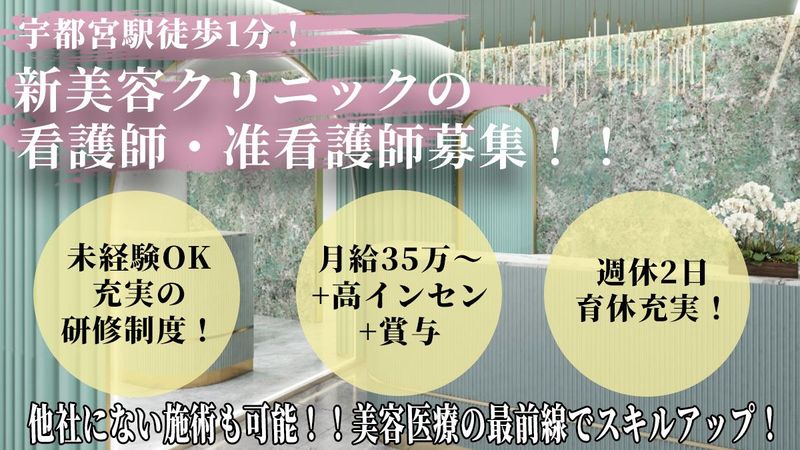 仕事内容 \宇都宮駅チカの美容クリニックで、看護師として新たな一歩を/ ✅ 月給35万円~+賞与・インセンで高収入 ✅ 売上連動インセン|先月は全員+10万円 ✅ 未経験OK!研修制度あり ✅ 週休2日+有給◎産休・育休も充実 ✅ 他社にない施術でスキルUP ✅ 20〜30代中心の活気あるチーム 【当クリニックについて✨】 幅広い美容メニューを提供する当院だからこそ、多彩なスキルが身につきます。 二重整形やリフトアップ、スキンケアから医療脱毛まで最先端の技術に触れられるため、「美容が好き」「最新の機器を使いこなしたい」という方に最適です。 施術は慎重かつ丁寧に行い、患者様の理想実現のためクリニック全員でサポートする風土が根付いています。未経験の方でも先輩スタッフがマンツーマンで指導し、一から安心して学べる環境ですのでご安心ください。 美容医療の分野で「患者さま一人ひとりと真摯に向き合いたい」方、ぜひご応募ください!! 【仕事内容✨】 ・ドクターの各種フォロー ・医師の指示のもと、医療機器を使った施術など ※美容業界未経験でも丁寧にサポートします! 従事すべき業務の変更なし 就業場所の変更なし