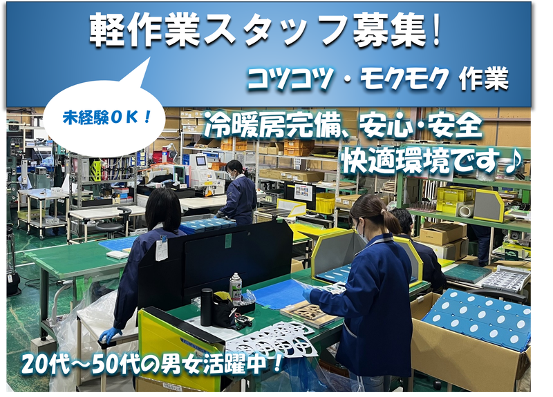 求めている人材 【必須条件】 高卒以上 【歓迎条件】 未経験/無資格さんも大歓迎! Wワーク/フリーターさん/主婦(夫)さん 活躍中です! 【こんな方にピッタリ】 ○コツコツ・モクモク作業が好きな方 ○ものづくりに興味があり、真面目に取り組める方 ○子育てしながら働きたい主婦の方 ○ライフスタイルに合わせて長く働きたい方