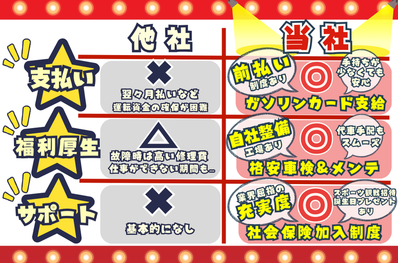 アピールポイント: ≪当社の取り組みと思い≫ * 当社は誕生日に≪エアフォルク米≫をプレゼント✨ * プロ野球・プロバスケの試合観戦チケット✨ * 社会保険の完備✨ などなど、、、ユニークな福利厚生を完備✨ 創業18年を迎えた≪エアフォルク≫では、 初心を忘れずドライバーと≪向き合う≫≪還元する≫を モットーに沢山のドライバーを支えています。 アナタのチャレンジも全力でサポートさせてください❗ アナタと働ける日を楽しみにしています。 ═══════════════════════════