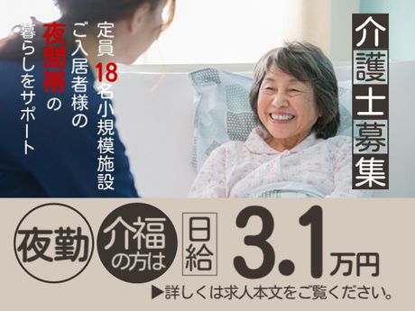 \小規模施設の夜勤♪1ユニット1名体制/初任者以上!日給2万7800円~|週2回~|交通費全額支給