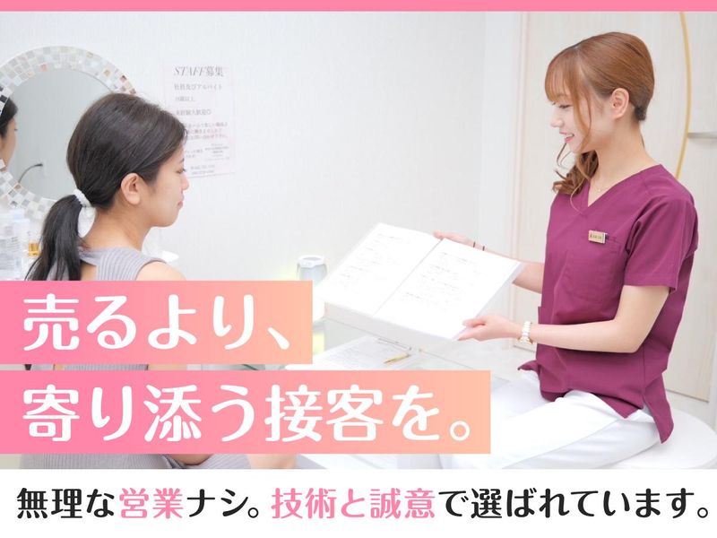 求めている人材 脱毛サロン・美容サロンの経験者 ▼以下の実務経験必須 ◆美容電気脱毛・ニードル脱毛経験 ◆美容電気脱毛資格 *経験年数は問いません *資格はなくてもOK <こんな方にぴったり> *接客が好き、人に喜んでもらう事が好き *お客様の気持ちに寄り添った対応ができる *ゆったりした環境で働きたい *営業よりも技術で勝負したい *将来は自分のお店を持ちたい …………………………………………………… <社員インタビュー> ◆オーナー 元々輸入の会社をやっていました。 脱毛の機械を取り扱う中で、機械により すごい差があることに気づきました。 そこで自分で機械を選別して、 いい機械をちゃんとした値段で施術したい という思いからサロンをスタート。 おかげさまで投稿サイトの口コミは4.79◎ お客様満足度とリピート率が高いことが 当サロンの強みなので、今後もそこを 強化していきたいと考えています。 ◆店長(20代女性/入社1年半) 前職では、休憩以外は座れないし、 終電で帰宅、朝早く出勤する毎日でした。 今は休憩時間に加え、予約の空き時間に 一息ついたり、早番なら19:00退社、 遅番だとお昼からの出勤と、 無理のない働き方をしています。 ◆入社1か月の社員さん/20代女性 無理な営業もなく、私でも頑張れると思った ことがきっかけです。元々、利用客のひとり として通った経験があり、接客スタイルと 空間が好きで入社を決意しました。 「常にお客様に寄り添った施術を していきたい。」 「お客様に一切嫌な思いをせずに 帰ってほしい。」 この想いが実現できるサロンだと思います。