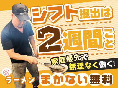 仕事内容 \第2期オープニングスタッフ募集/ 新たなお店の雰囲気作りを 一緒にしていきませんか? *10時~17時の間で 3時間から働けます♪ *週2日からの勤務で、 家庭やプライベートと両立可能◎ 子育て中のママさんスタッフや がっつり勤務のフリーターさん 本業との兼合いで働くWワーカーも 無理なく活躍中★ ╭━━━━━━━━━━━╮ | この求人のポイント | ╰━v━━━━━━━━━╯ ✅優しい店長&スタッフがサポート! ✅美味しいラーメンのまかない付き! ✅服装・髪型・髪色自由♪ ✅頑張りに応じて昇給・社員登用あり! *・―・*・―・*・―・*・―・*・―・* ┏━━━━━━━┓ ⧉ お仕事詳細 ⧉ ┗━━━━━━━┛ ✨「家事や子育ての合間に働きたい」 「空いた時間を活用したい」 といった主婦(夫)さんや 「しっかり働いて収入を安定させたい」 といったフリーターさんにも ピッタリです! \具体的には…/ ✅ラーメン店内での ・簡単な清掃 ・配膳 ・盛り付け …などがメインです。 ●スタッフは2名体制 落ち着いた環境で焦らず作業できます。 ●座席数は20席 カウンターとテーブル席があります。 ●食券機あり レジ対応がないので オーダーミスの心配もほとんどなし♪ *・―・*・―・*・―・*・―・*・―・* ┏━━━━━━━━┓ ⧉ お店について ⧉ ┗━━━━━━━━┛ 店全体を見渡しやすく、 分からないことはすぐに相談できる環境。 「次はこんな仕事も覚えてみよう」 とステップアップできる雰囲気です 服装や髪型・髪色は自由! おしゃれを楽しみながら働けます! ラーメン作りにも挑戦したい方、 接客やチームで動く仕事が好きな方 も歓迎。 頑張りに応じて 昇給や社員登用もあるので、 「アルバイトから正社員を目指したい」 という方にも最適です! 将来の中心メンバーとして 活躍してくださる方をお待ちしています! 頑張りに応じて自慢のまかないは ラーメン食べ放題♪ \✨店長&スタッフについて✨/ 店長は、いつもスタッフを気にかけて 「何か困ってない?」 と声をかけてくれる優しい人♪ 先輩スタッフも親切で、 わからないことがあれば すぐに相談できる雰囲気です。 *・―・*・―・*・―・*・―・*・―・*
