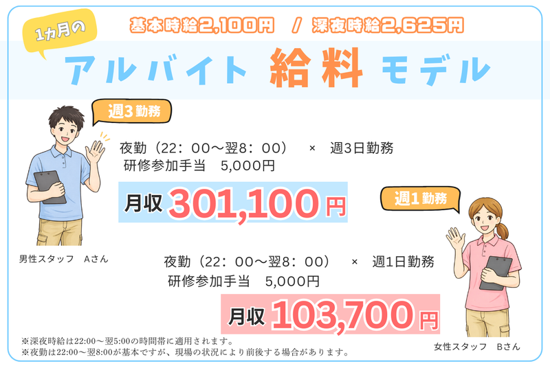 勤務時間詳細 実働時間:1日あたり10時間 平均勤務日数:1ヶ月あたり4日 〜 12日 実働10時間~12時間(週1日~OK)