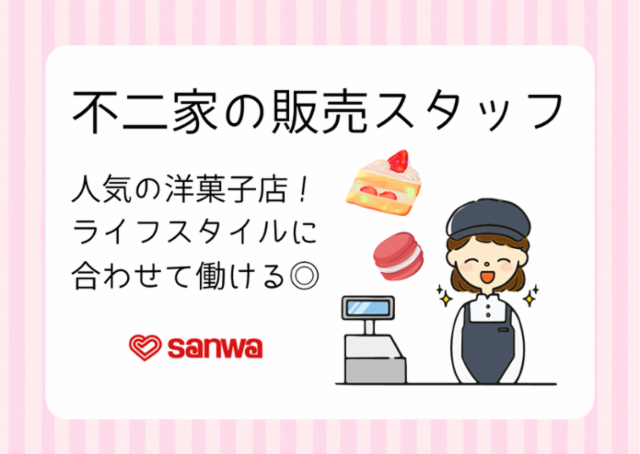 仕事情報 ● 仕事内容 店舗内にある不二家で、接客、ケーキの販売、商品詰め、レジ業務などをお願いします。また、ケーキなど洋菓子の製造補助をお願いすることも。盛り付けなどの簡単なお仕事なので、未経験でも安心。先輩スタッフが丁寧に指導します。お客さまの笑顔があふれるケーキ販売のお仕事、ぜひご応募ください! 研修があるから安心 未経験やお仕事のブランクがあっても安心!不二家の研修で、マニュアルを見ながら、座学と実践で洋菓子販売の基礎を学ぶことができます。商品管理や廃棄の仕方など、食品全般に応用できることを学べるのが魅力。「ケーキが好き」「洋菓子が好き」な方はぜひお気軽にご応募ください。 バイトデビューなら三和! 「駅前の店舗で安心」「明るい雰囲気だから」そういった理由で親御さんが初めてのアルバイトをスーパー三和に推してくださることが多いです。学業との両立に向けても親身になって相談に乗りますよ!小さいころから通っている三和だから、バイト&パートデビューも安心! 和気あいあいとした現場 まじめで穏やかな方が多い三和のスタッフ。年齢や雇用の垣根がなく和気あいあいとした雰囲気の職場です。「先輩主婦からアドバイスをもらえる」「夕飯の献立はスタッフみんなで考える」などの声も。勤続年数が10年以上続くベテランスタッフも多いのも納得の環境で、ぜひ一緒に働きましょう! 事業紹介 町田・多摩地区、横浜・相模原を中心に地域密着型スーパーマーケットを経営。食品・雑貨の「スーパー三和」の他、低価格コンセプトの「フードワン」など78店舗を展開(2024年8月時点)。直営加工センターの食品を各店舗に卸す自社物流も強みです。末吉、八丁畷、矢向や川崎駅からも通いやすく便利です。