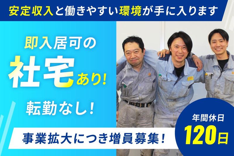 【保険制度】 雇用保険、労災保険、健康保険、厚生年金 待遇・福利厚生 【福利厚生】 ■賞与あり ■交通費全額支給 ■入社支度金 L 入社月に5万円 ■住宅手当 L 借上社宅非居住者のみ対象 ■借上社宅 L 単身用、世帯用共に完備 (上限5万円、期間:10年間or40歳まで) ■福利厚生倶楽部(リロクラブ)加盟 ■中型免許取得補助 L トラックの移動がある為 ■奨学金返済支援制度 L 規定有*5年間/月1万円まで ■資格手当 ■家族手当 L 1万円(配偶者)、4千円(第1・2子)、3千円(第3子)、 2千円(第4子以降、その他の被扶養者(父母も含む) ■残業手当 ■退職手当 ■熱中症対策用品支給 L 飲料水、サプリ等 ■社員紹介制度/3万~10万円 ■食事代補助 L 1食240円で美味しい お弁当が注文可! ■転勤なし ■車・バイク通勤OK(規定あり) ■駐車場完備