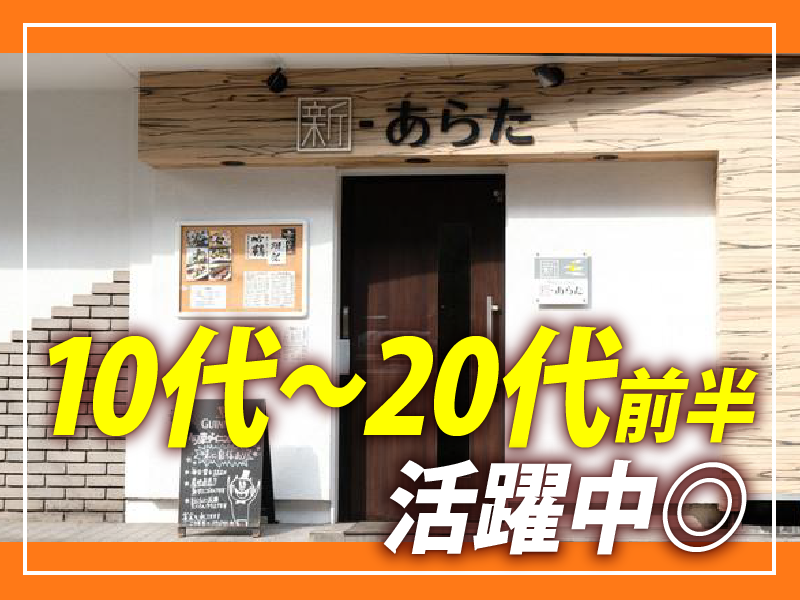 仕事内容 【求人のポイント!】 ✅ほぼ毎日インスタ更新中! 自慢の絶品まかない(無料)あり ✅週末(金土)いずれか1日含む週2日〜OK タイパ良く稼げる! ✅高時給1300円〜1600円 高校生も同条件! ✅大入り手当&長期手当ありでモチベUP ✅1日4時間〜短時間も相談OK 「仕事はきっちり、遊びは全力!」 がモットー。 \平均年齢18歳!/ 10代〜20代がメインで活躍中の 活気あるお店です✨ *・。 。・**・。 。・**・。・* ╭━━━━━╮ 仕事内容 ╰━v━━━╯ 接客を中心としたホール業務を お任せします! ◆お客様のご案内 ◆オーダー・注文取り ◆料理やドリンクの配膳 ◆テーブルの片づけ ◆店内の簡単な清掃 など ⏩メニューの数が多いので 最初は覚えることが多いですが、 丁寧に教えるので 未経験でも心配いりません◎ 高校生からスタートした スタッフも多数活躍中! *・。 。・**・。 。・**・。・* ╭━━━━━━━╮ お店について ╰━v━━━━━╯ 【旬菜ダイニング新】は、 スタッフの仲の良さが自慢の 個人居酒屋! 卒業した先輩が飲みに来るほど 居心地が良いんです♪ \ほぼ毎日更新!/ SNSをチェック✨ 当店の名物は、なんといっても 「無料のまかない」。 店主が腕を振るった料理を、 ほぼ毎日Instagramに アップしています! 「どんな雰囲気?」 「どんなご飯が食べられる?」 気になったら、 SNSを覗いてみてくださいね✨ *・。 。・**・。 。・**・。・* ╭━━━━━╮ 募集要項 ╰━v━━━╯ ◆週末(金土)いずれか1日を含む週2日〜OK! ◆1日4時間〜OK! ◆高校生もOK!(時給の区別なし) ✨週2~3日勤務できる方歓迎! 当店は高校生時給を定めていないので、 通常のスタッフと同じく高時給で 働くことができますよ! 過去には時給1500円の高校生も◎ まずは「元気な挨拶」と 「明るい笑顔」があれば大丈夫! 未経験でもしっかりサポートします♪