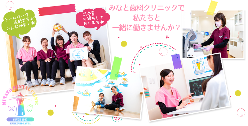 求める人材: 『歯科医院で働いた経験のない私にも出来るか心配』と、お思いのあなた!大丈夫です。 みなと歯科クリニックは未経験者、大歓迎です!! 未経験の方でも、丁寧に一から指導していきます。 実際、既存のスタッフの大多数が全くの未経験者でした。 はじめは分からない事だらけ、覚える事だらけで大変そうでしたが、 みんなで助け合いながら成長し、今ではみなと歯科クリニックにとって 『なくてはならない存在』です。 受付や歯科助手に特別な資格や技術は必要ありません。 ・人と話すことが好き。 ・お掃除や片付けが好き。 ・子どもが好き ・おじいちゃんおばあちゃんが好き。 ・働く事が好き。 ・人の笑顔を見るのが好き。 ・自分に自信を持ちたい方。 という方のご応募をお待ちしています。 (パソコンが得意な方、歓迎します)